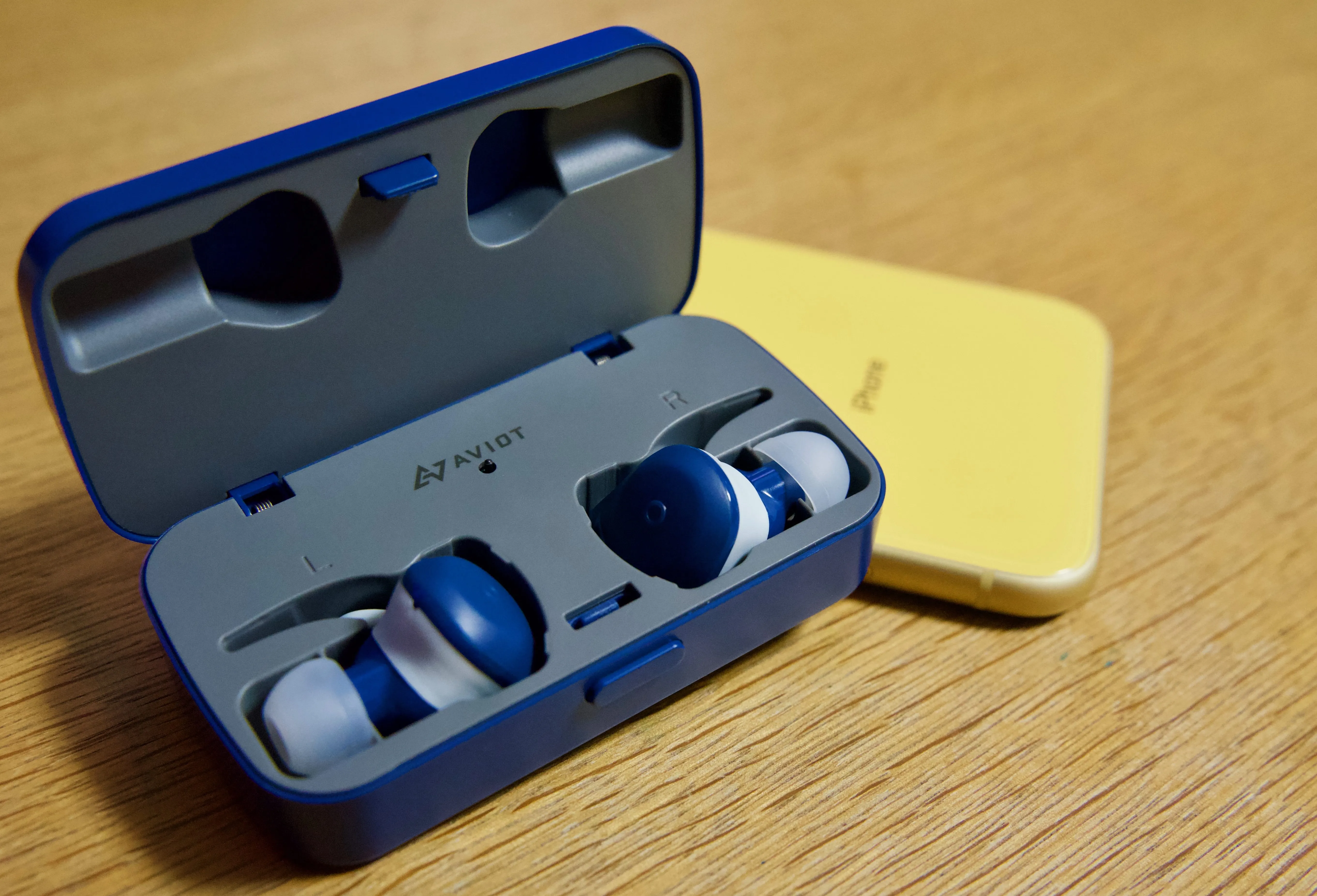 レビュー とりあえずケースから見ていきます。正直かなりチープなケースですが、コストを削ってその分価格に反映してくれている感があるのでグッド。かなり軽いです。 充電端子はmicroUSB。ここはTypeCにして欲しかった。USB端子の上にはバッテリー残量を示すランプが4つ。 ケースのサイズは左右分離型イヤホンとしては標準的。服のポケットに楽に入るAirPodsのケースと比べるとかなり大きく感じます。 側面のボタンを押すとケースの蓋が開くのですが、実のところ蓋がかなり緩い ので別に押さなくても簡単に開きます。カバンに無造作に入れておくと、勝手に蓋が開いてイヤホンがカバンの底に沈んでいる ことがしばしば。これはAVIOTさん改善してください。 レビュー等読んでいても「蓋が閉まりにくい!」という意見が散見されますが、実は強く押し込むとカチッと音がして蓋がロックされます。閉まったな、と思ったところからさらに強く押しましょう。しっかり閉じます。AVIOTさんすみません。先日ケース触ってて気がつきました。 イヤホンを取り外すと充電用の電極が見えます。イヤホンに特にストッパーなどはなく、ケースからの着脱は簡単に行えます。つまり蓋が開くと簡単に外れてカバンの中で電源オンです。頼むから改善してくれ。先に言っておくと、不満はここだけです。 一切問題なしです。 イヤホン本体は軽く、装着感もかなり良いです。遮音性もバッチリ。さらにかなり音が良い です。AACとSBCのみの対応でAptXには対応しないので、手持ちのスマートフォンがAACに対応しているか要確認ですね。iPhone、Andoird8以降の大抵のスマートフォンならAACが使えるのでOKです。 iPhone XRと接続して使っていますが、ケースから外した際の自動接続もしっかり動作しますし、NFMIでないにも関わらず左右間の途切れもほとんどありません。Bluetooth5.0のおかげでしょうか?接続安定性はAirPodsに及ばないまでもかなり高い方だと思います。 ステムは標準的なものなので、コンプライ等を装着することも可能だと思います。白い装着ガイド的な部分は柔らかい素材でできており、取り外しも可能。 付属品。このポーチに入れておけばカバンの中で事件が起こらない気がしますが、いちいち出し入れしたくないのが本音。