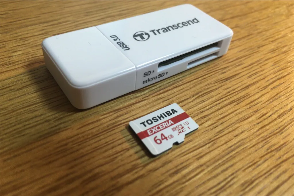 上位版に比べると大きく劣りますが、それでもEXCERIAでないmicroSDに比べると高性能であるので、値段を考えると妥当な性能かと。ちなみに裏面は黒色です。 今回使用したカードリーダはこちら。 UHS-1、USB3.0に対応しており、かつ値段も1000円を切る定番ですね。秋葉原で600円で購入。