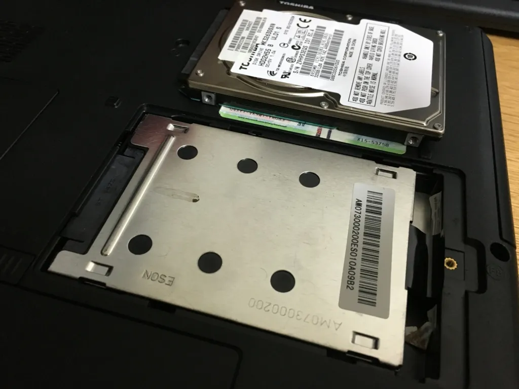 横にスライドさせるとトレイごと外れます。四隅のネジを外すと、HDDが取り出せます。これをSSDに換えて組み直していくワケですね。