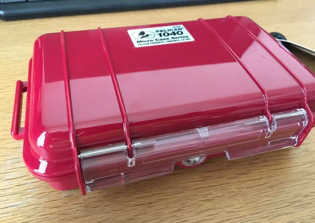Pelicanケースには複数のサイズがあり、「micro case series」には1010から1060までの7種が存在。番号が若いものほどサイズが小さくなっています。 カラーは黒、赤、青、黄。さらに上部がクリアーのものと不透明なものが存在します。今回購入したのは1040の赤。