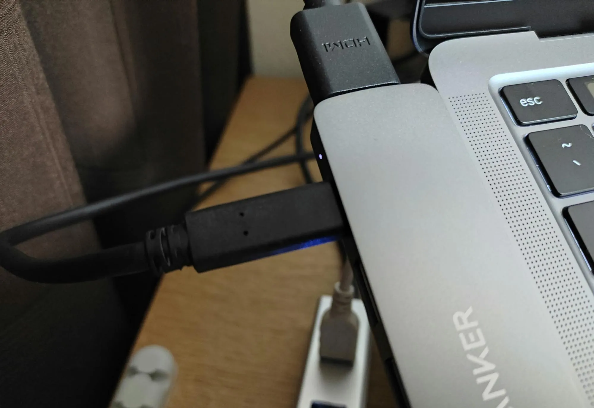 側面のUSB-C端子は何気に15W(5V・3A)とそこそこ高出力 であるため、スマートフォンの充電に便利そう。MacBook Pro・Airも非常に遅いが充電できる。この端子から映像入力は不可。USB-CからHDMIへ変換するアダプタを繋いでみたが、出力も不可。(擬似デイジーチェーンができたらテンション上がったけどさすがに無理)
