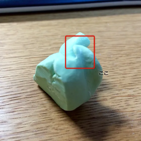 こうです。この出っ張りの部分、まっすぐ切り落としてしまいます。(薄々要らない気はしていたんですが、さらにフィットしなくなる気がしてなかなか踏み出せずw)さらに、リュータでヘリクス部全体をほんの少し小さめに軽く、なめらかに削っておくと、付け外しのしやすさがかなり変わってくると思います。