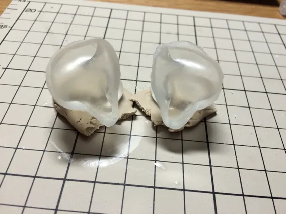 カナル部の長さも少しずれていたのでここで修正。もう一度シリコン型を取り、デブコンETで複製します。狙い通りフィット感は良好!必要であれば、リュータなどで形を再度整えておきます。
