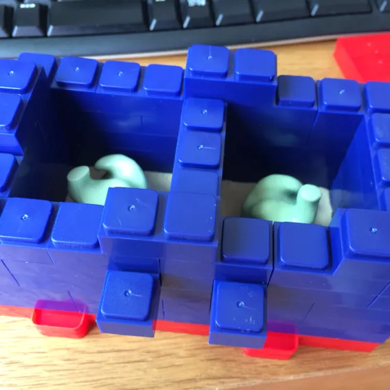 Mr.型取りブロックを組み立て、シリコンを注入する準備を。必ずMr.シリコーンバリアーなど、離型剤を底面のねんどとインプレッションに塗っておきましょう。離型剤を粘土に塗る際、粘土が溶けて筆に付くので、インプレッションは粘土より先に塗ると汚れにくくなります。