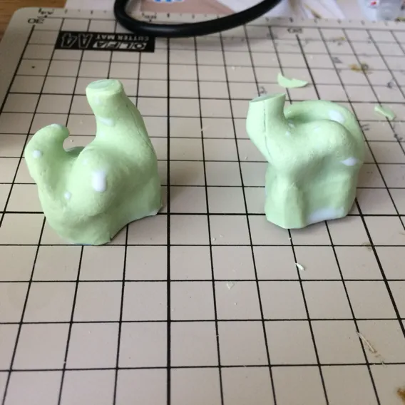 これをデブコンETで複製したものをマスター型として成型しなおすつもりなので、この時点で完成品の形にまで成型する必要は特にありません。が、インプレを加工の方がやはり削り、切りやすいので加工は圧倒的に楽ですね。とにかく強気にそぎ落としていきます。ミスしても瞬間接着剤で付きますから。