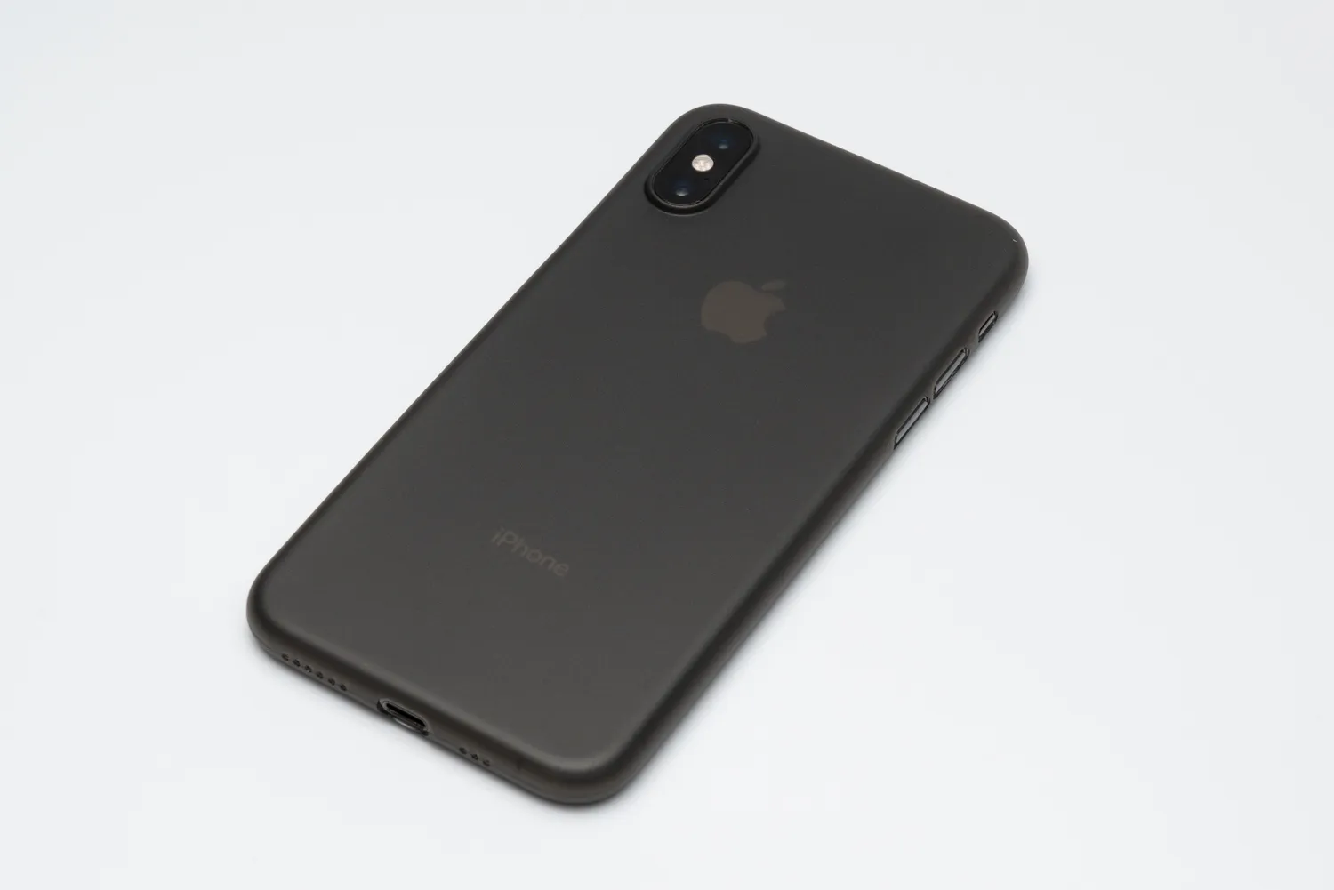 スペースグレイのiPhone Xsに装着したところ。装着前のケースなしの状態とほぼ区別の付かないサイズ感です。遊びや浮きは一切なく、完全にピッタリとフィットするように作られています。Appleのロゴマークが透けて見えるのが良いですね。
