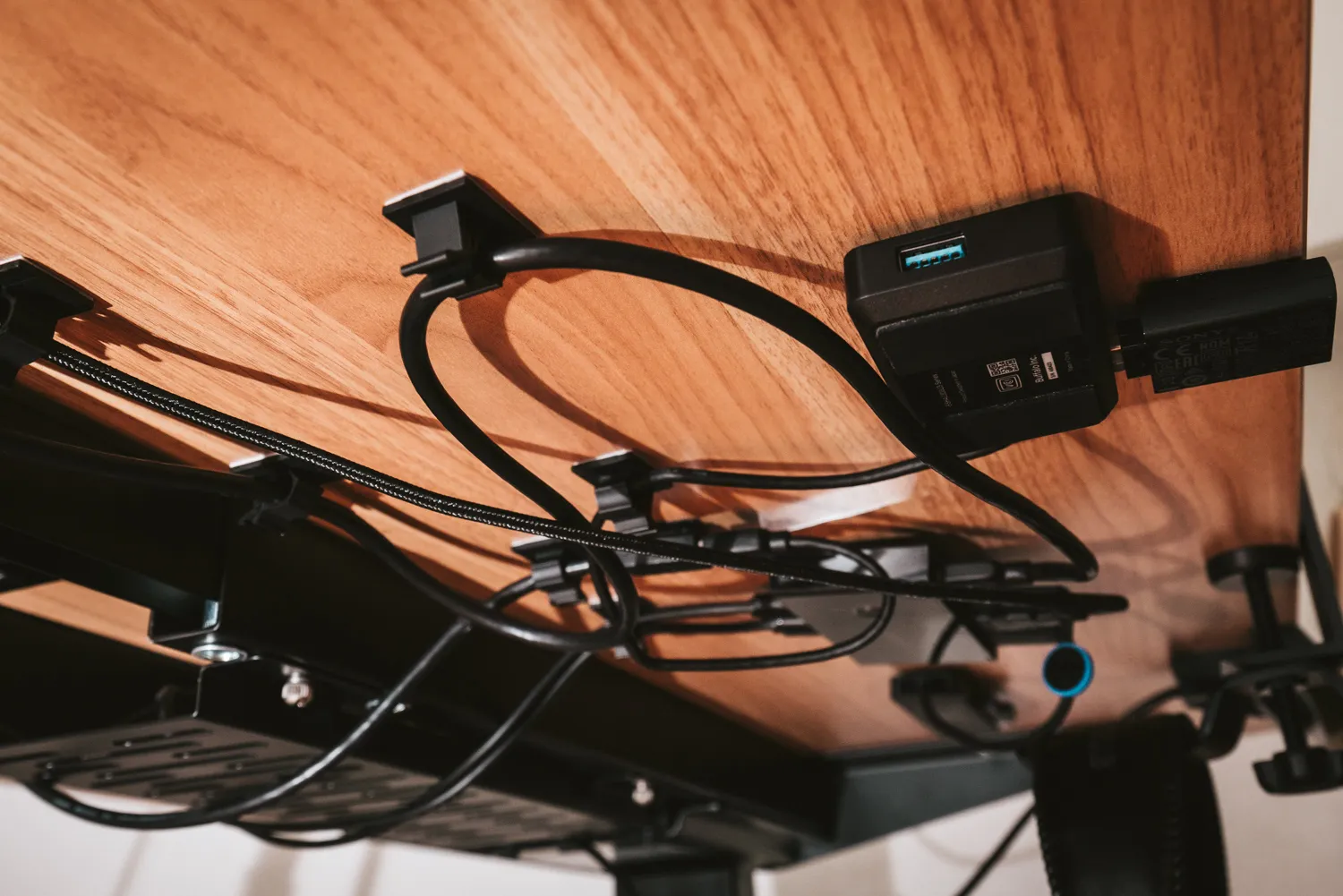天板裏にはUSBケーブルやUSBハブなどを貼り付けています。私物のデスクトップPCと、仕事用のMac miniでマウスやキーボード等のUSB機器を共有するため、USB切替器を使用しています。