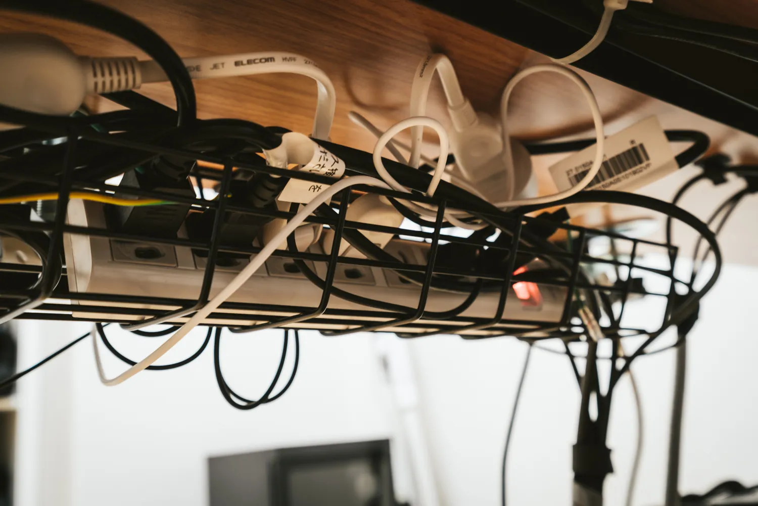デスクを反対側から見たところ。前面からはできるだけケーブルが見えないようにまとめているのですが、裏側はボロが出ますね。もちろんもっと綺麗にまとめることも出来なくはないのですが、このデスクは昇降式のため、デスクの高さを上げた時にケーブルが突っ張らないようにマージンを取る必要があります。