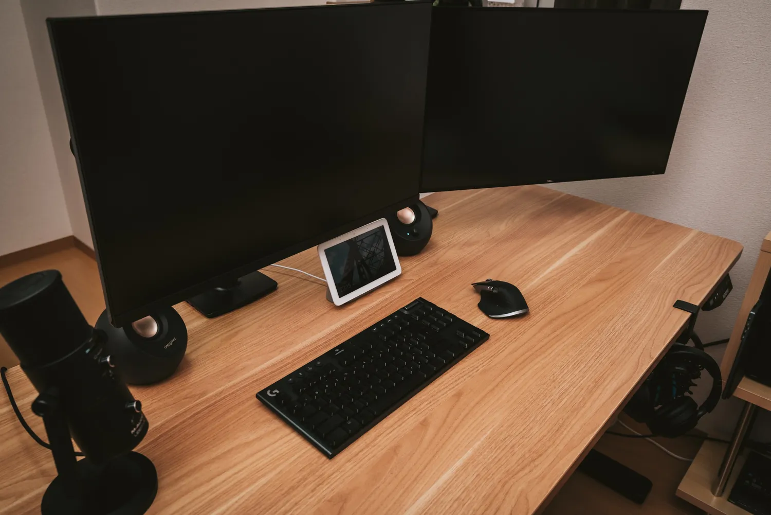 メインモニター下にはスマートスピーカーの「Nest Hub(第一世代)」を設置。仕事中に音楽を垂れ流すのに使っています。内蔵スピーカーは壊滅的に音が悪いので、bluetoothでPebble V3と接続しています。スマートスピーカーは絶対にディスプレイ付きの物の方が便利だなと痛感。自室のエアコン、サーキュレーター、照明などをボイスコマンド一発で操作できるのが楽しい。