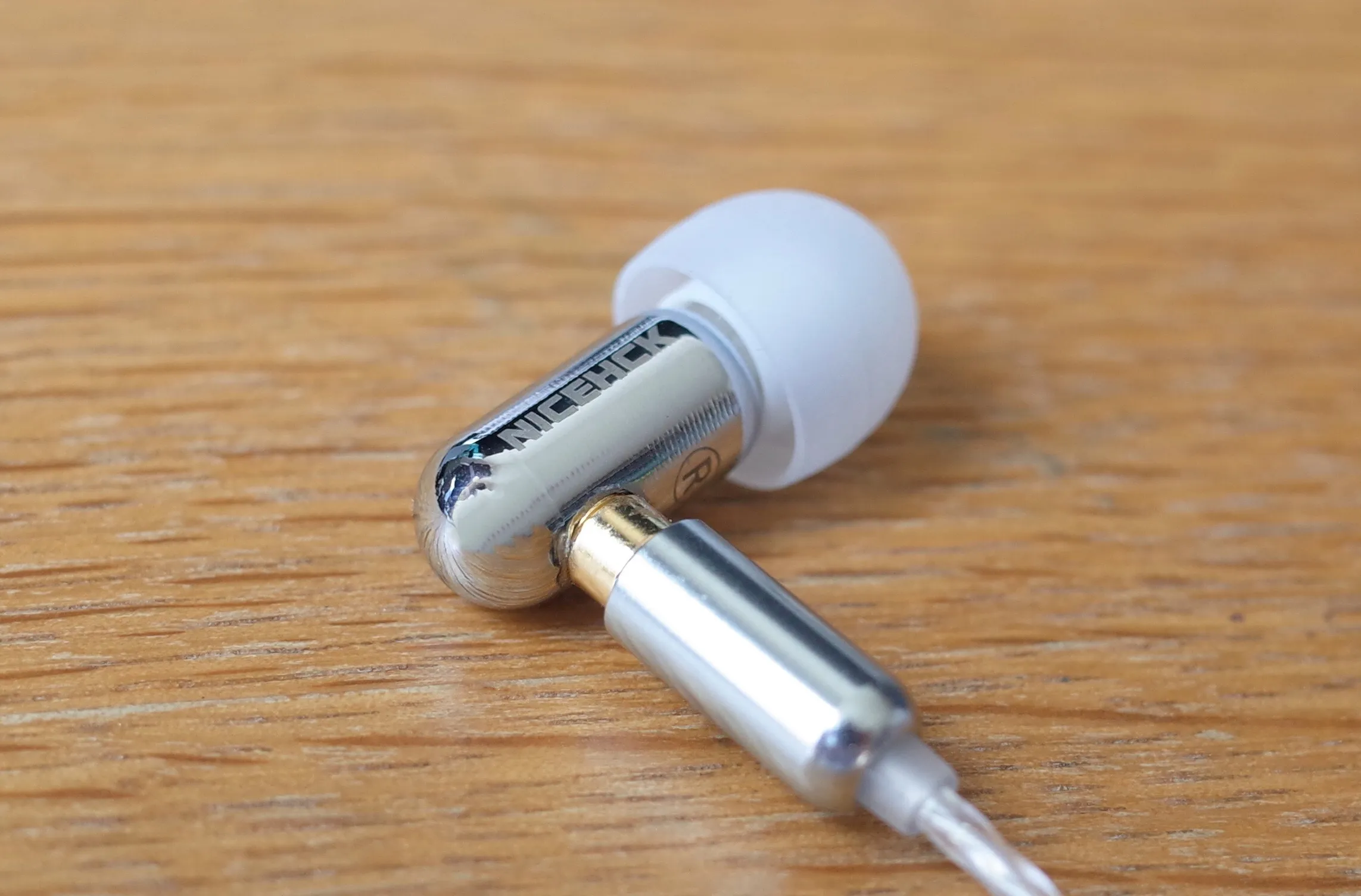 筐体は適度に重みもあり、シングルBA機らしく小型でなかなかカッコいい。装着感も上々。本体の形状はシンプルで左右で全く同じもの。ロゴのプリント面、LR識別のプリントのみが左右で異なります。