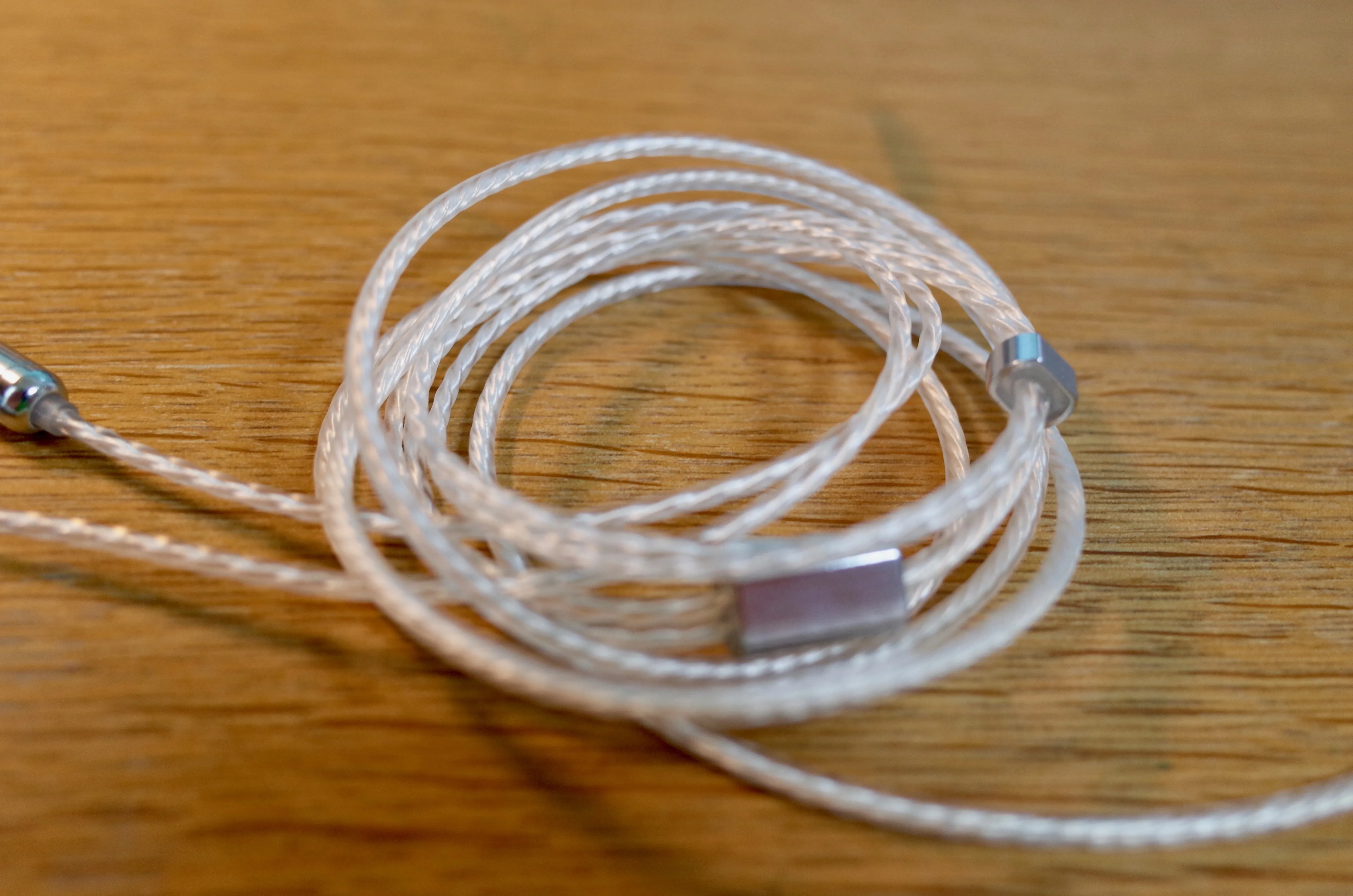 2.5mmバランス環境がないので3.5mmを接続。細く柔らかく、癖もつきにくい扱いやすいケーブルです。ケーブルの材質は二本とも共通。