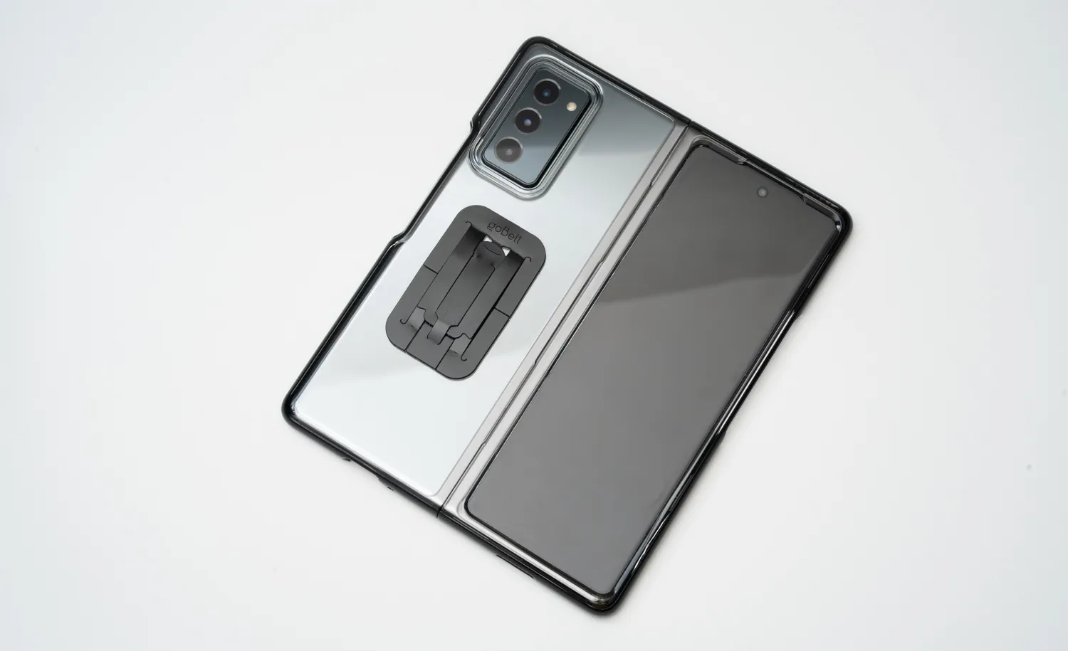 重さ、厚みのあるFold2を置いても問題なし。ケースとgoBeltが装着されている状態でも問題なく急速ワイヤレス充電が可能。