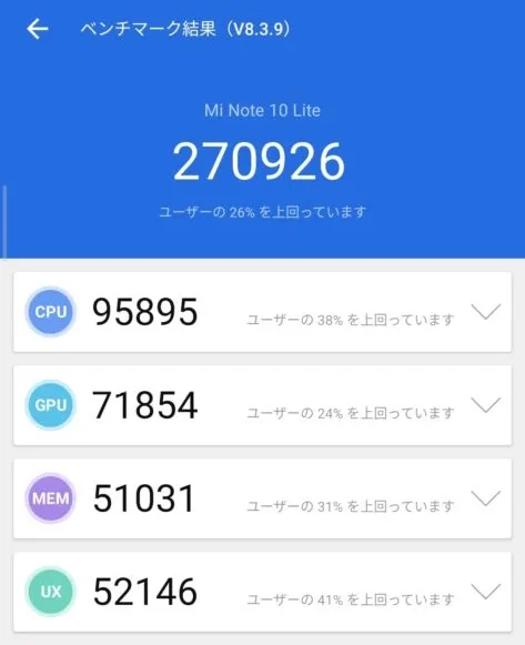 参考に、同じSoC、メモリ容量であるXiaomi Mi Note 10 Liteのスコアが以下となります。
