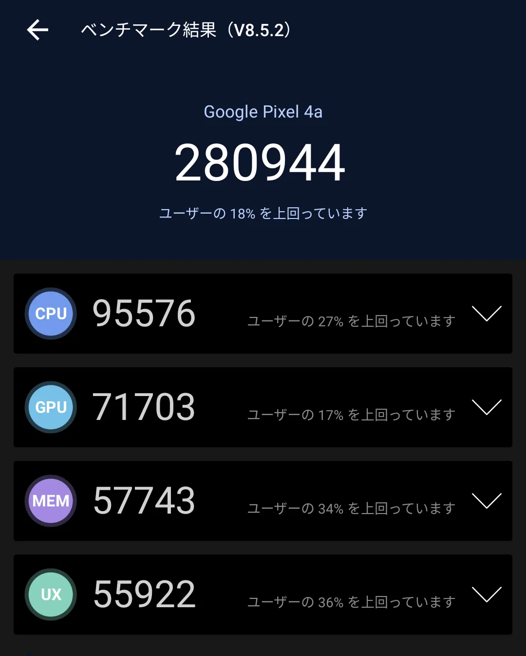 メモリがPixel 4aの方が高性能なようで、総合では1万点の差が出る結果となりました。意外と差が出るものですね。
