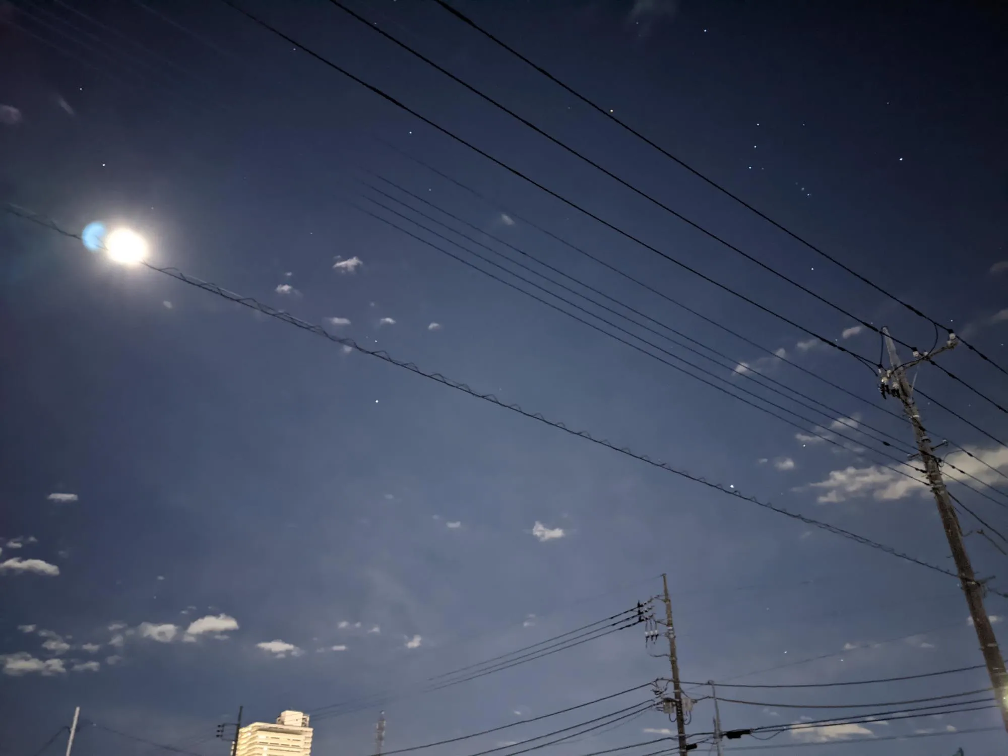 夜景撮影モードであれば手持ちで星が写ります。コンビニ行ったついでに適当に撮っただけなので色々許して欲しい。画質はイマイチですが、オリオン座が写っていることが分かります。