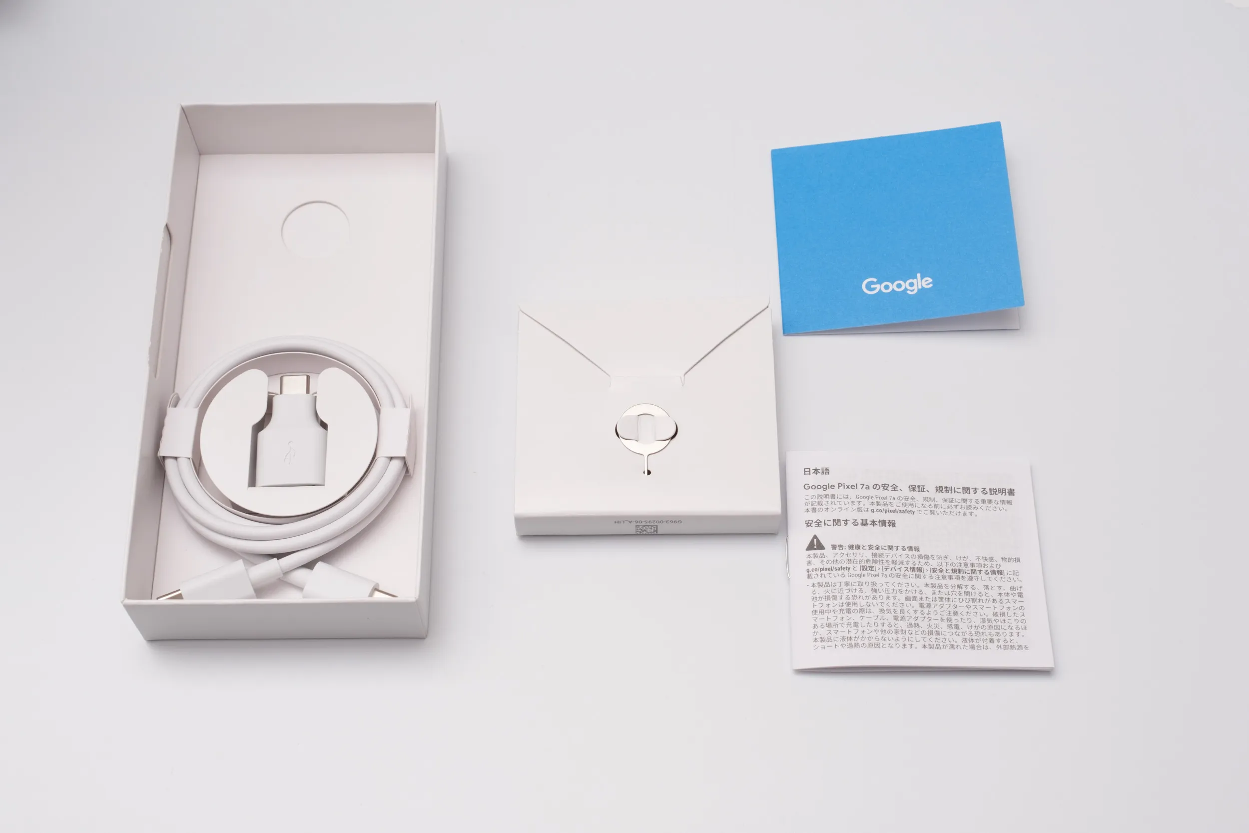 付属品。変換アダプタ、USB-Cケーブル、SIMスロット取り出し用のピンと、いつものPixelと同様。