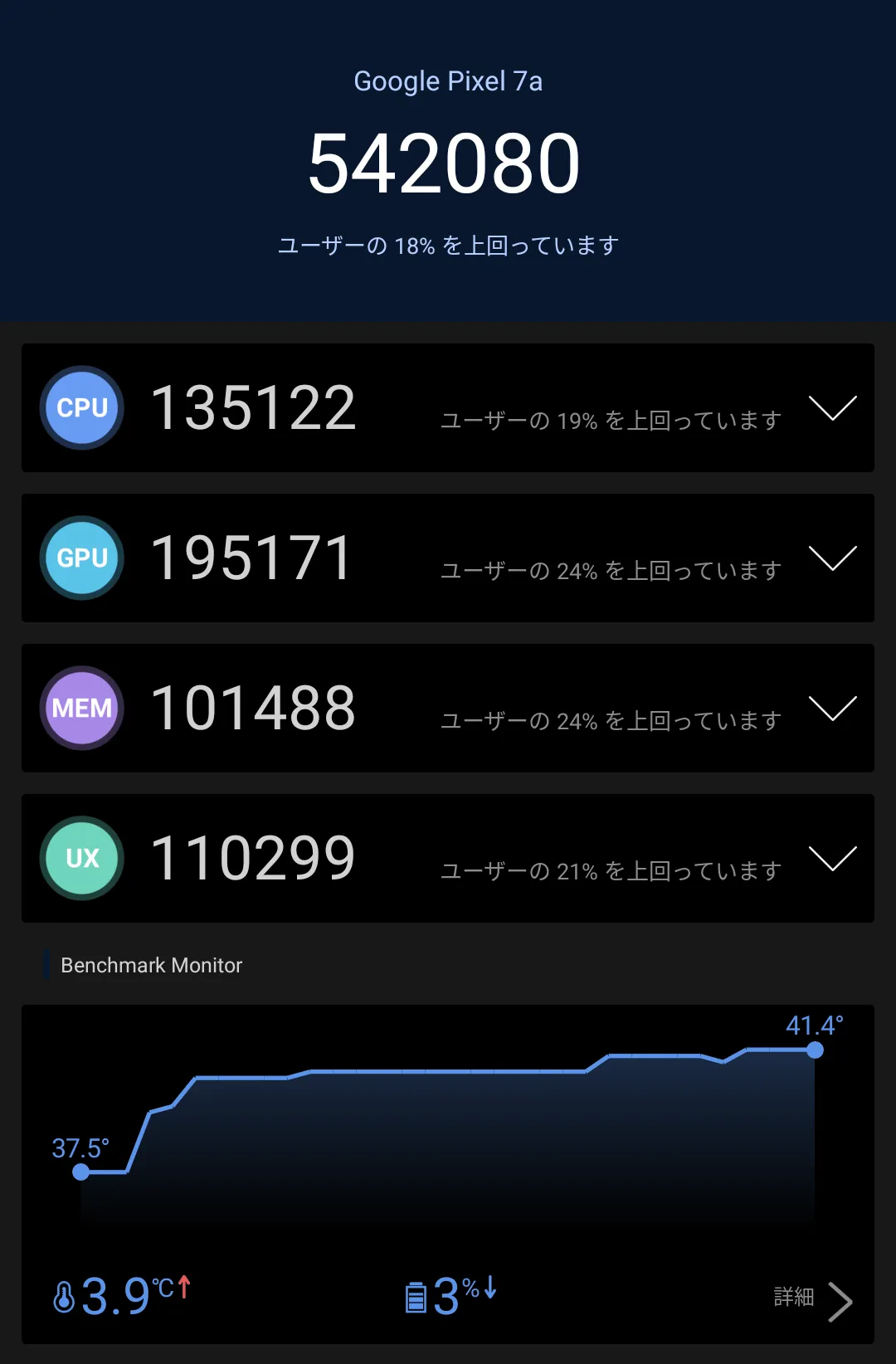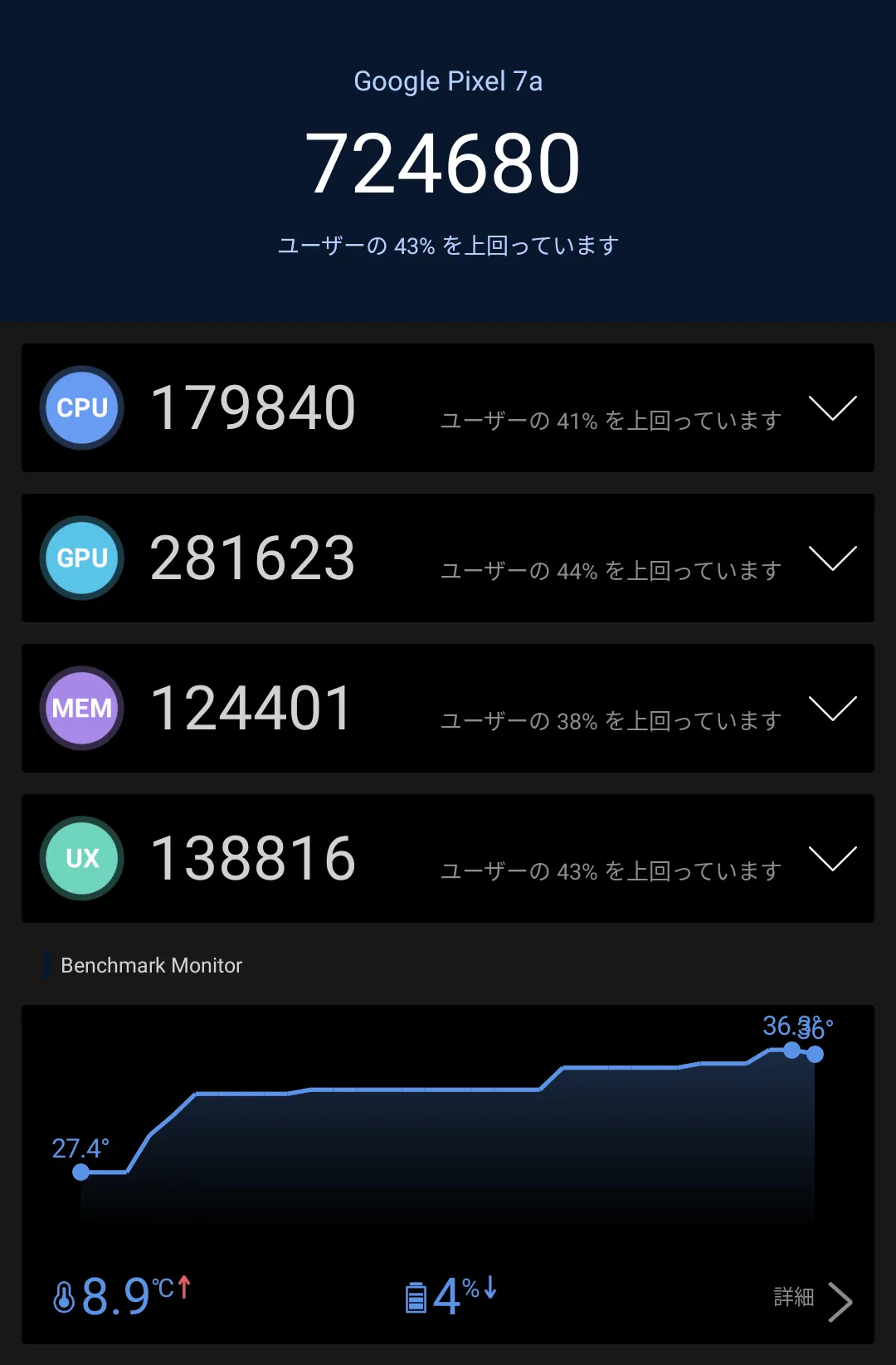 半日ほど放置した後に再度計測したところ、70万点強とTensor G2らしいスコアが得られました。廉価版のaシリーズと言えども、上位モデルの7・7Proと遜色ないスコアを発揮しています(まあSoC同じですしね)。セットアップ直後は裏で色々最適化処理等が走っているので、スコアが伸び悩むのでしょう。