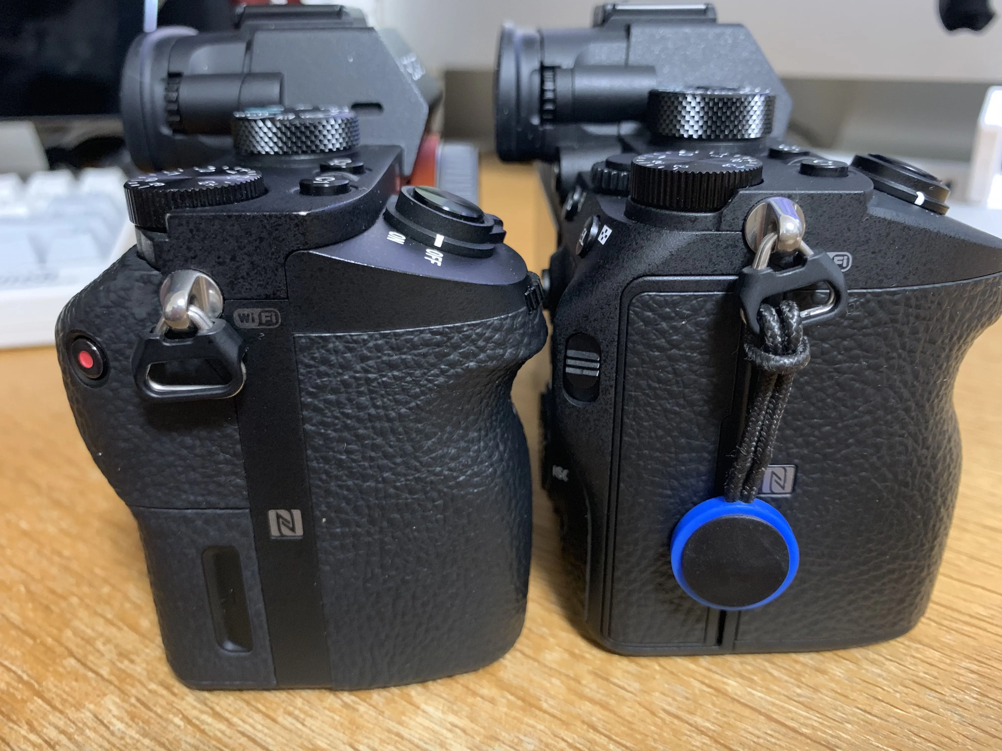 右側面は大きく変わりました。握るとグリップ形状が大きく変わったことがわかります。ストラップ金具の位置が上部に移動し、握った際に右手に干渉しにくくなりました。これはα7IIで気になっていた部分なので嬉しい。これまた意味不明な位置にいたRECボタンも移動しました。