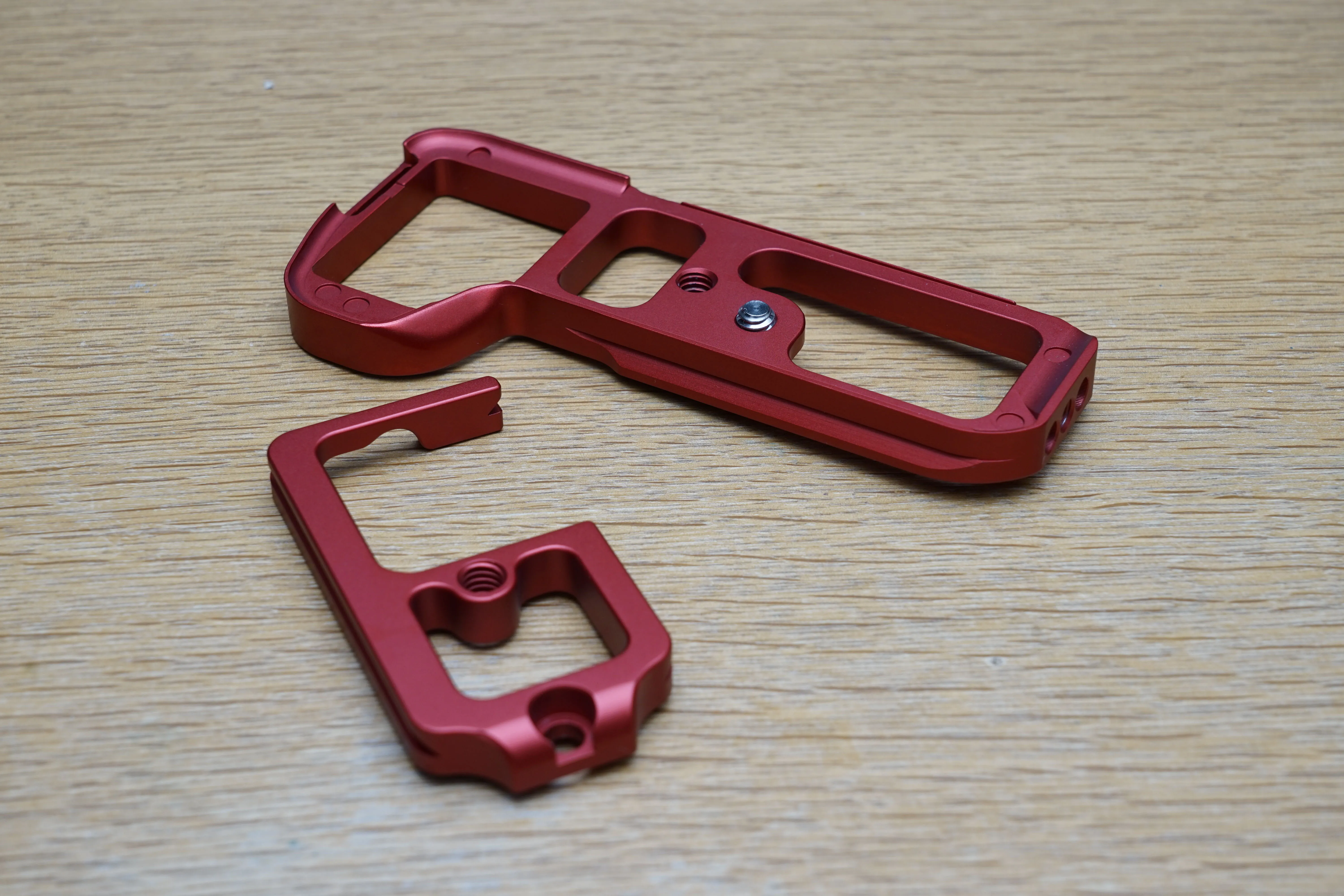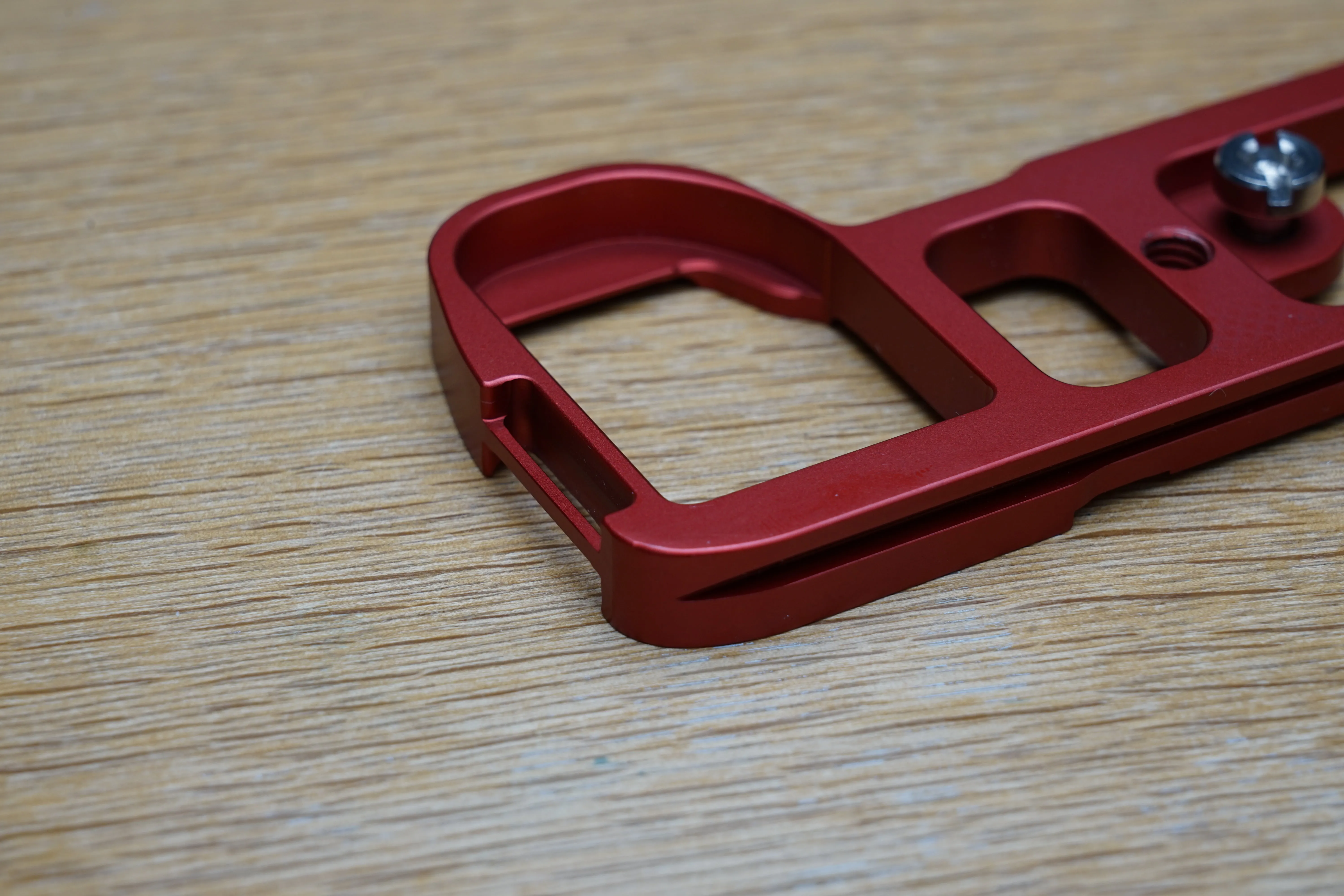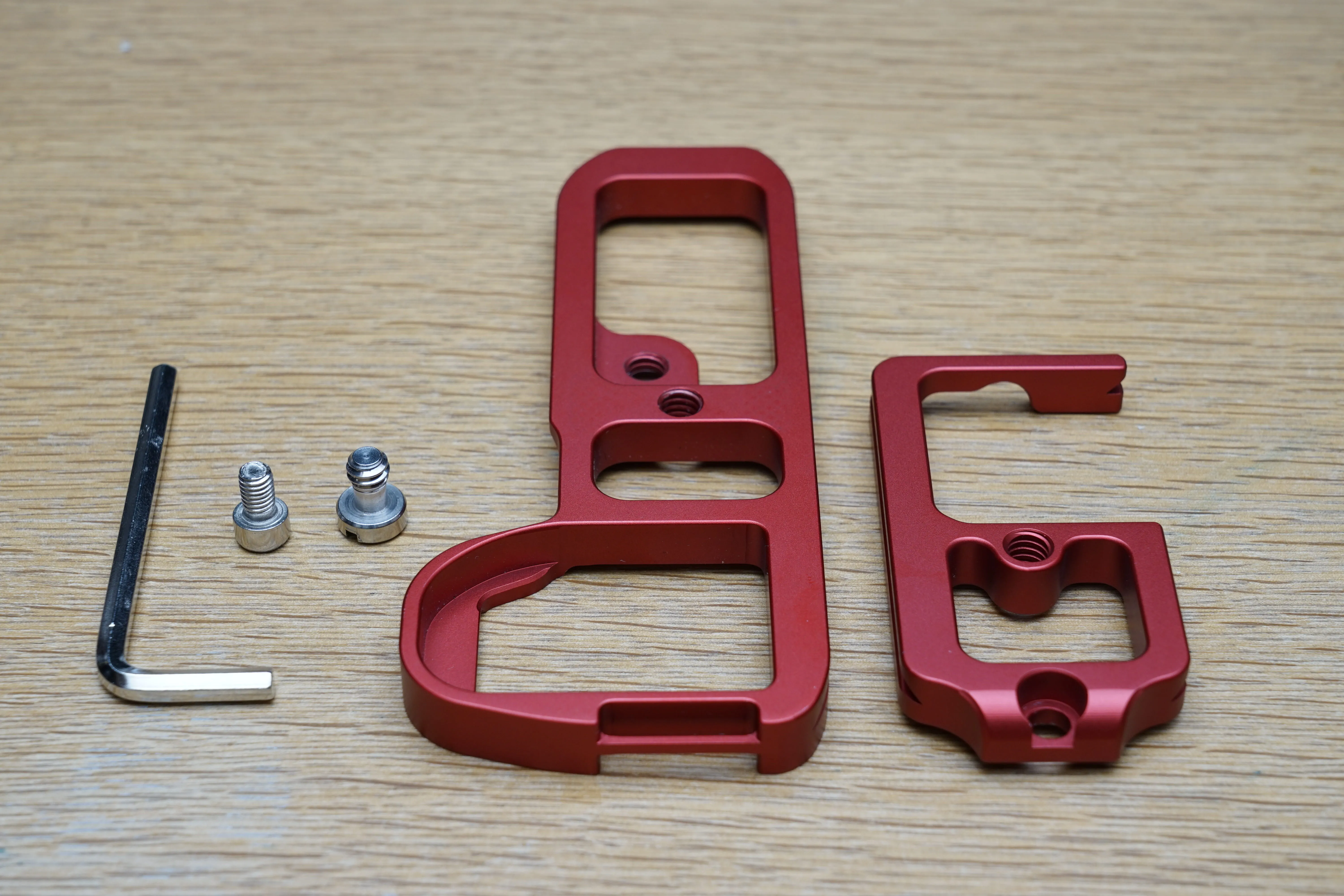 そこで、代替として三脚用クイックリリースブラケットを購入することにしました。色々なカメラで使える汎用品が安く買えますが、今回はα7II専用を謳う「INPON L型クイックリリースブラケット」を選択。カラーはブラック、シルバー、レッドが存在。あえてレビューの見当たらないレッドを購入してみました。2999円と、純正グリップの3分の1以下の値段で購入できます。
