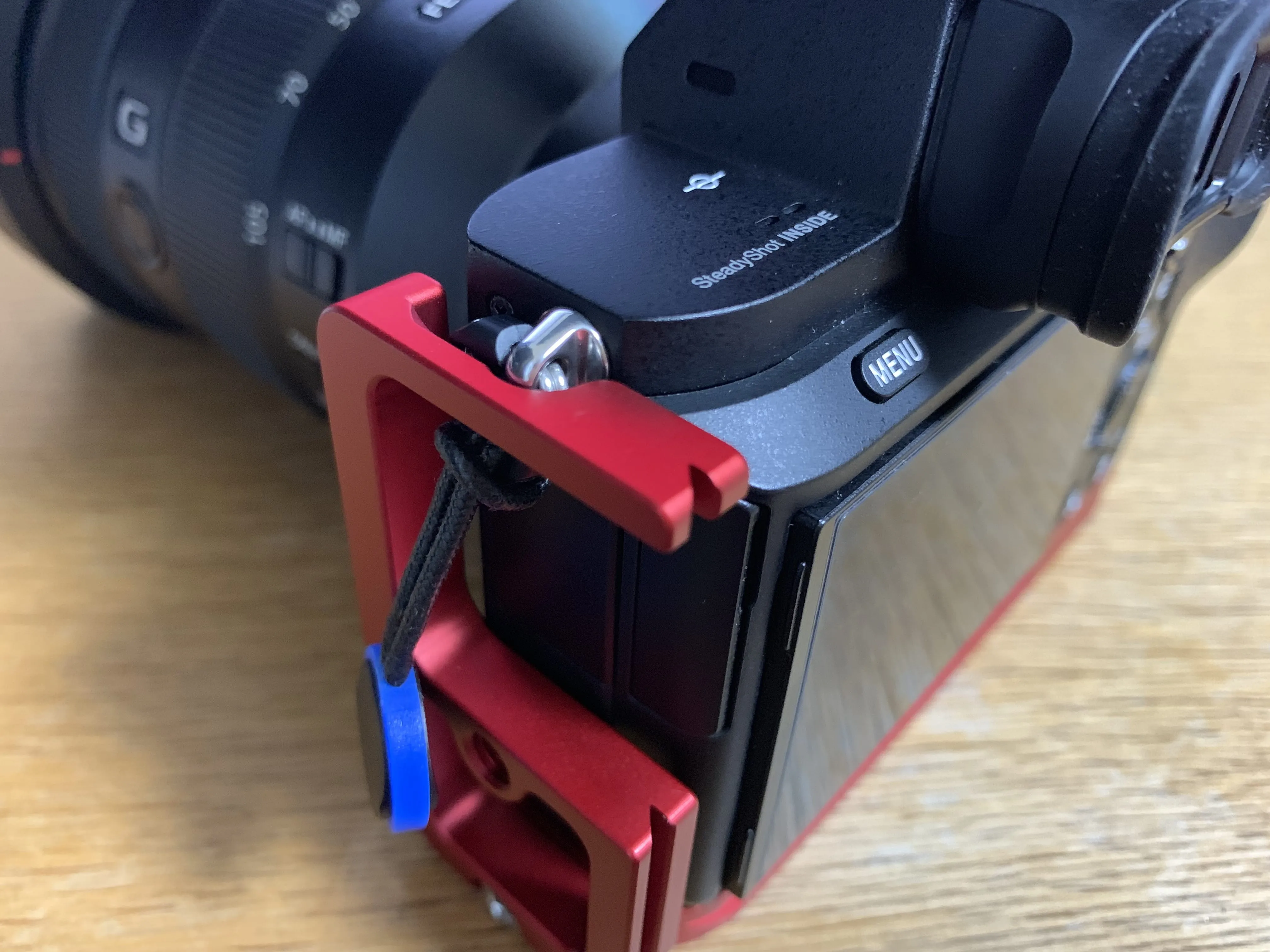 純正アクセサリにもこの問題に対処するためのものはあるのですが、これが実売1万円と異様に高い。また三脚穴も使えなくなります。安定して置くこともできなくなるのでこれはナシ。