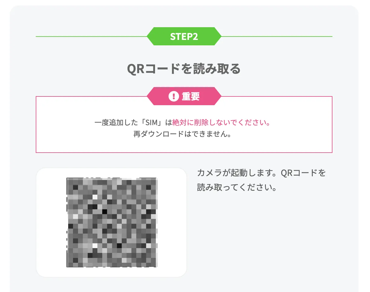QRコードを読み取り、eSIMを設定します。「再ダウンロードはできません。」と記載がありますが、無料で再発行が可能です。