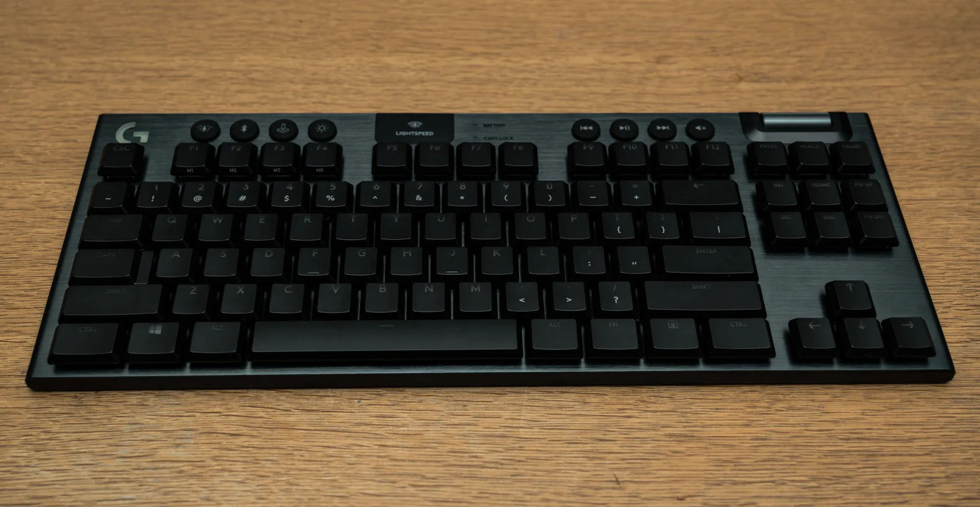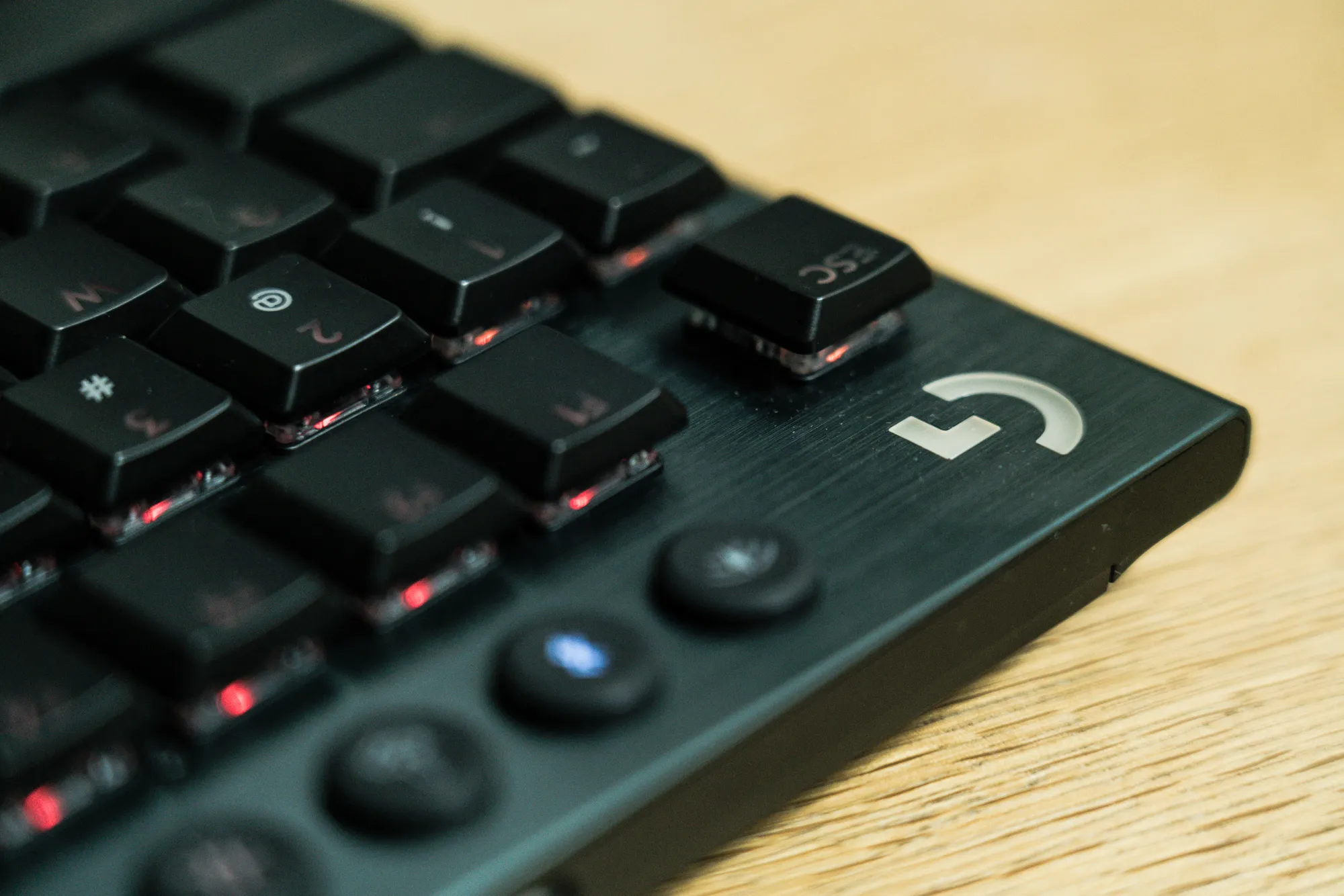 上部左側のボタンは左からLIGHTSPEEDへの変更・Bluetoothへの変更、ゲームモード、LED輝度調整となります。ゲームモードをオンにすると、Windowsキー等のゲーム中に反応して欲しくないキーが一時的に無効化されます。ゲームモードで無効化するキー・キーに内蔵のLEDの発光パターンは専用ソフトウェアのG HUBでカスタマイズ可能です。