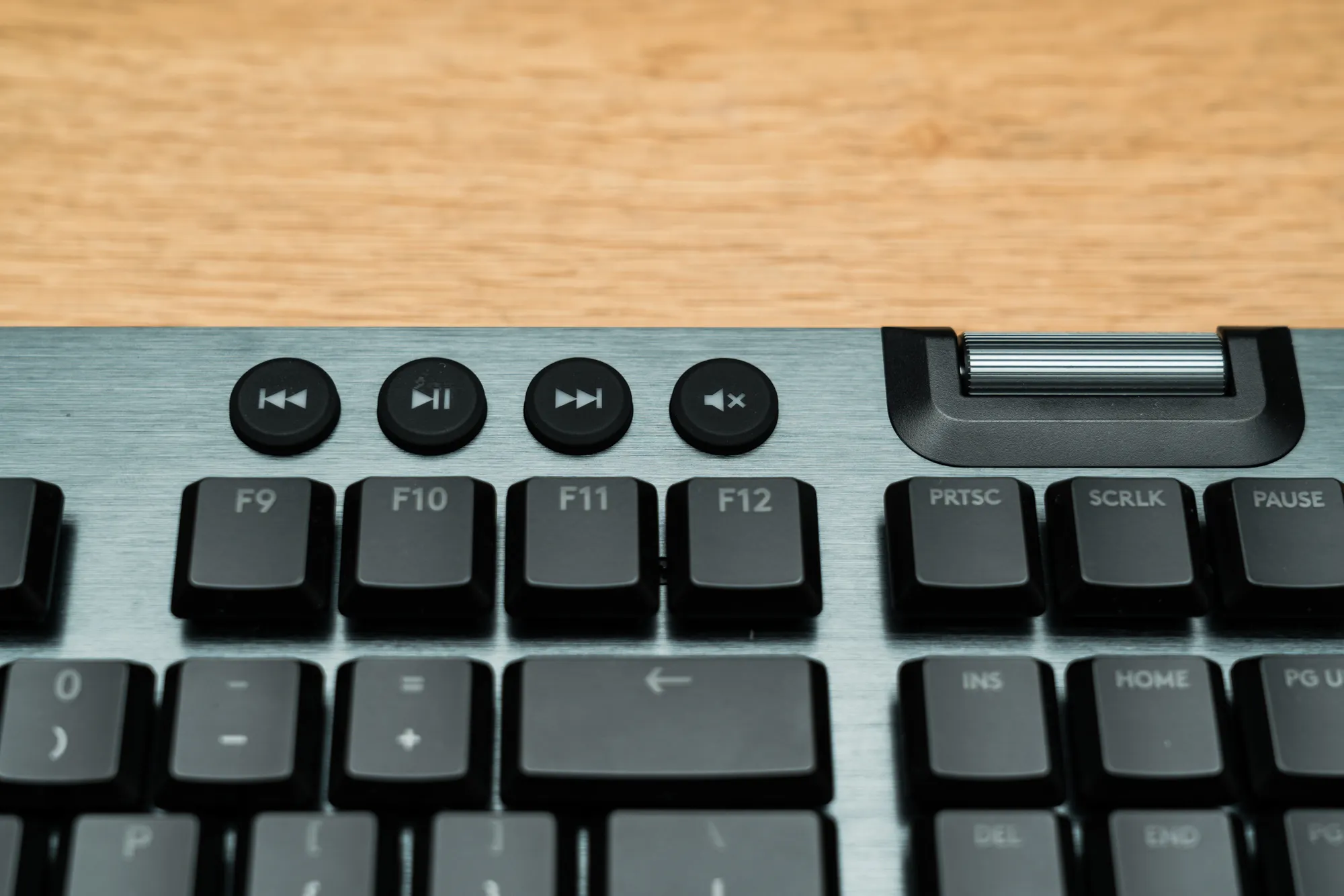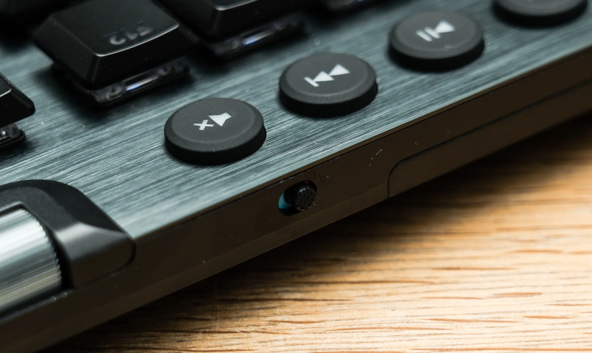 上部右側のボタンはメディアコントロール、更にキーボード右端のダイアルはボリュームコントロールになっています。メディアコントロールキー・ボリュームダイアルはフルスクリーンでのゲームプレイ時に非常に役立ちます。マイクミュートボタンもあれば完璧でしたね。