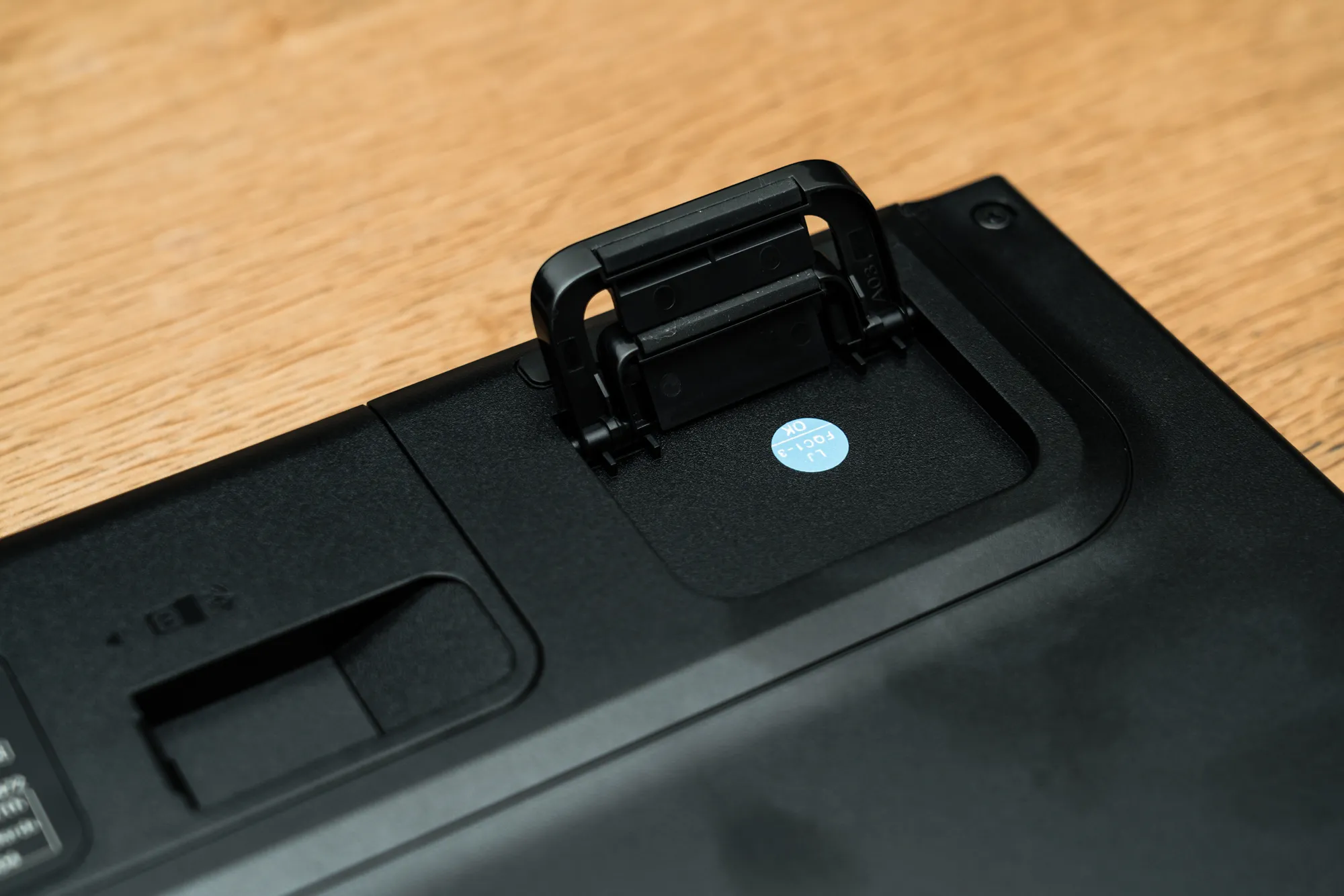 筐体裏には格納式の脚があり、これを立てることでキーボードに傾斜を付けることが可能。