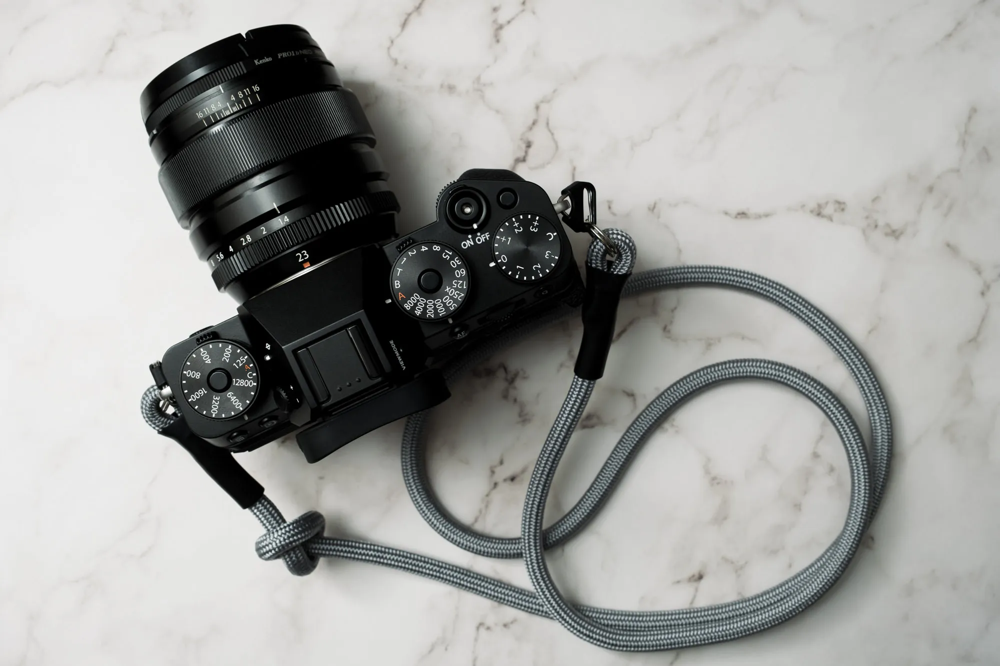 7mm径と細めのストラップではあるものの、前述のとおり伸縮性が皆無のため、首にストラップが食い込んで痛むということが起こりにくくなっています。X-T5とXF23mmF1.Rの組み合わせでは、557g + 300g = 857gとなりますが、このくらいの重さであれば一日首に掛けていても大丈夫そう。