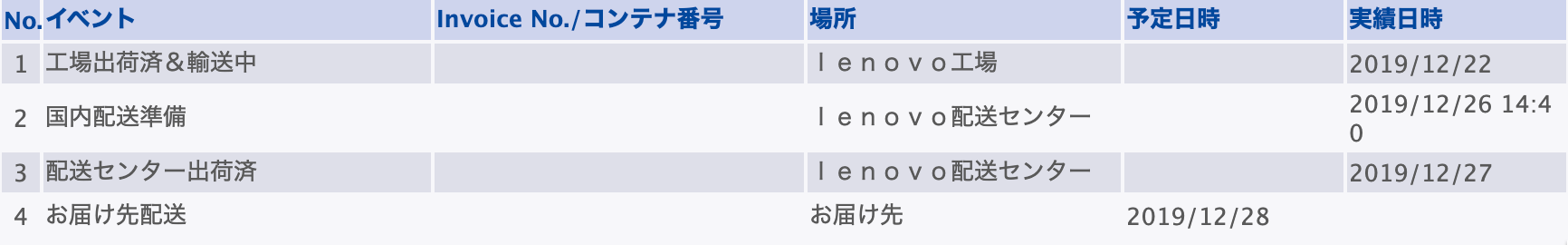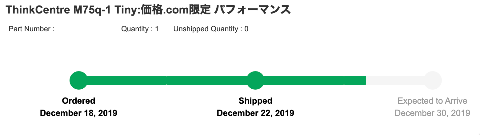 12/22の昼過ぎに発送連絡が来ました。ここで一気に到着予定が短縮され、12/26となりました。その後、到着予定日が12/30に変更されていましたが、結局12/28に到着しました。