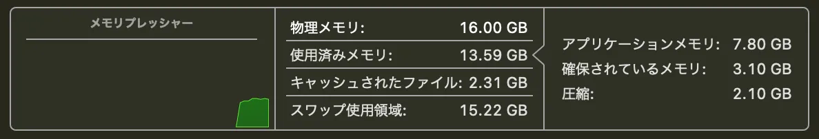 Intel Macであれば絶望を感じるような状況でも、メモリプレッシャーはグリーン表示なのが恐ろしいですね。どうせ16GBでも足りないのなら、8GBメモリで安価に済ませるのも一つの考え方かもしれません。