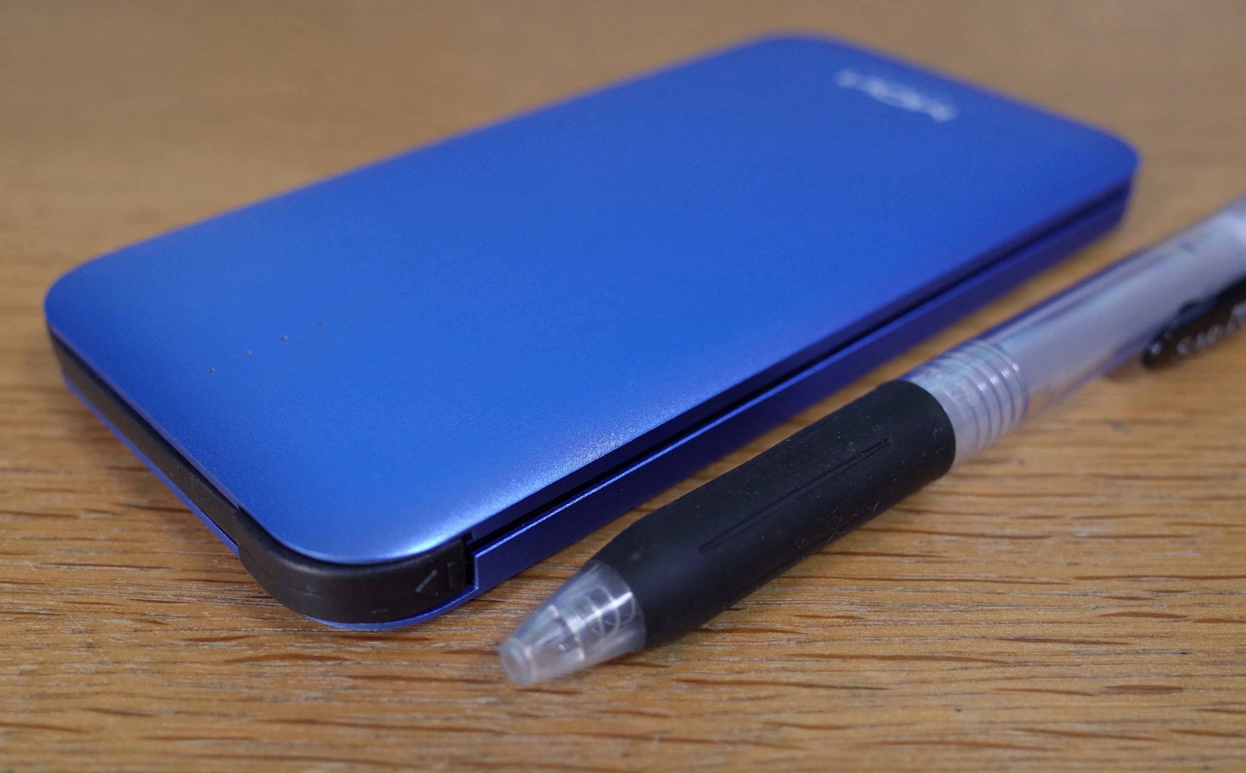 厚みはボールペンと同程度。今のモバイルバッテリーって10000mAhモデルでもこんなに薄いんですね。
