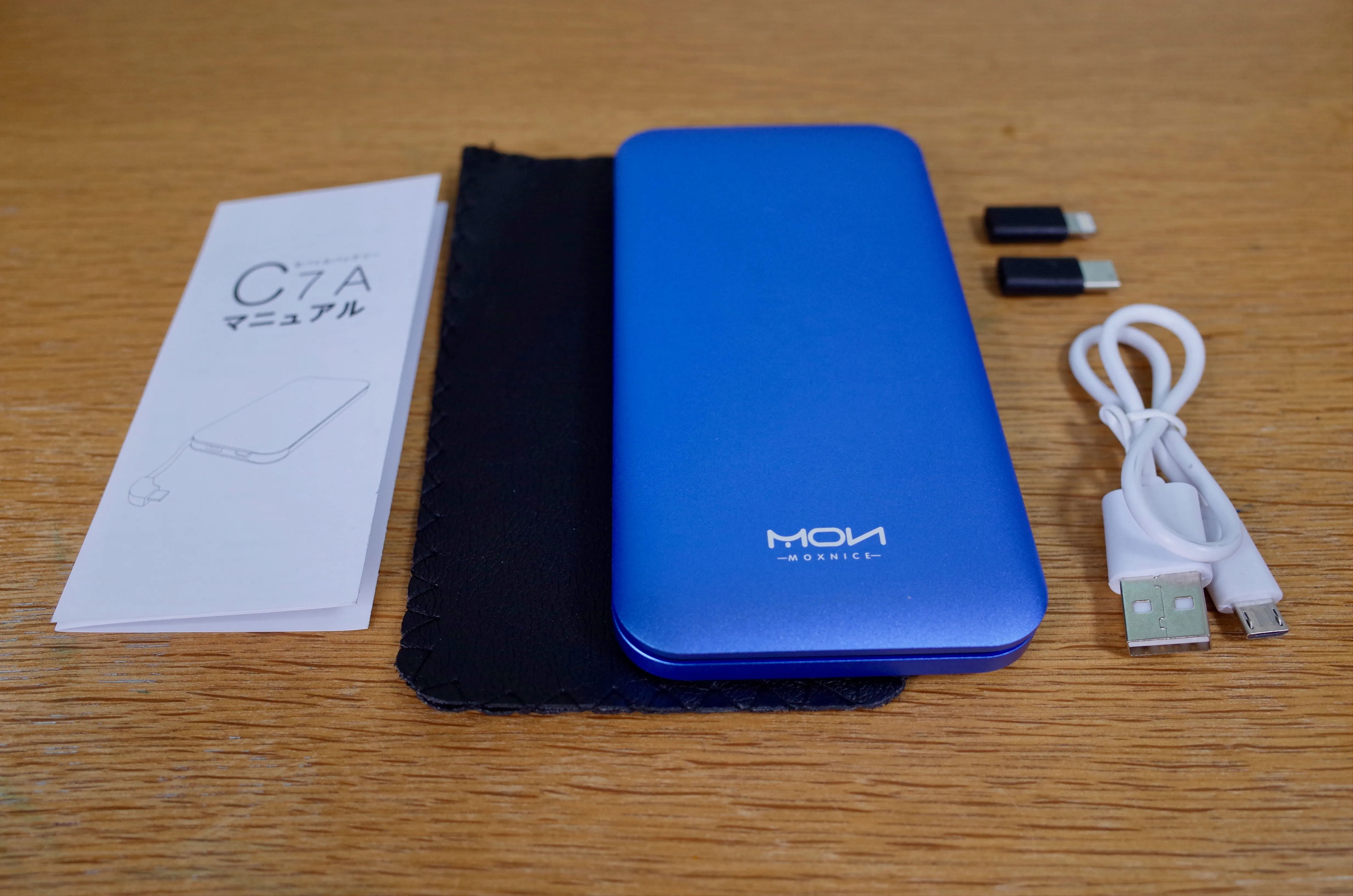 付属品。布製カバー、microUSBケーブル、microUSB-Lightning変換コネクタ、microUSB-TypeC変換コネクタ、マニュアルが付属。マニュアルは完全日本語です。