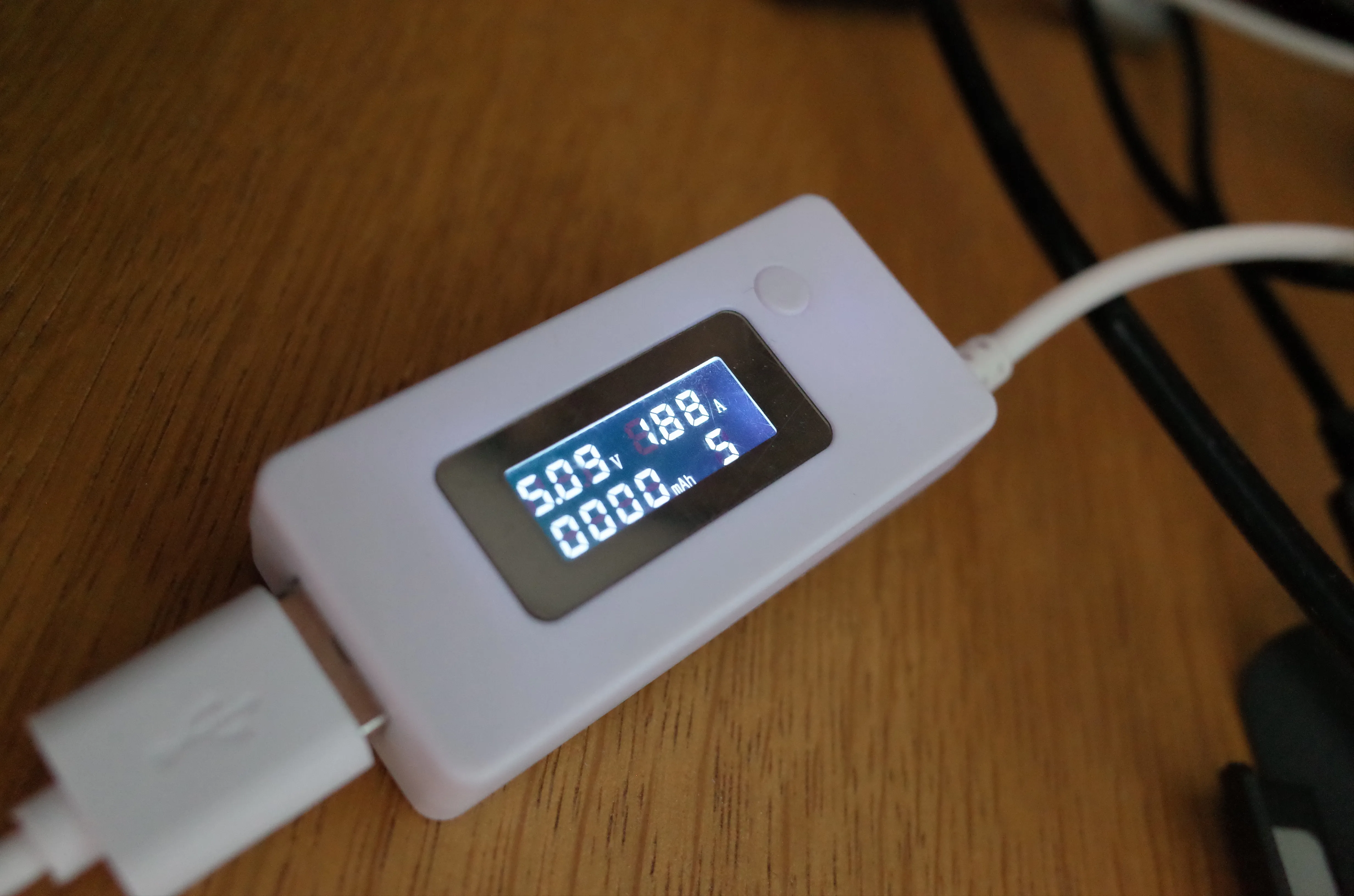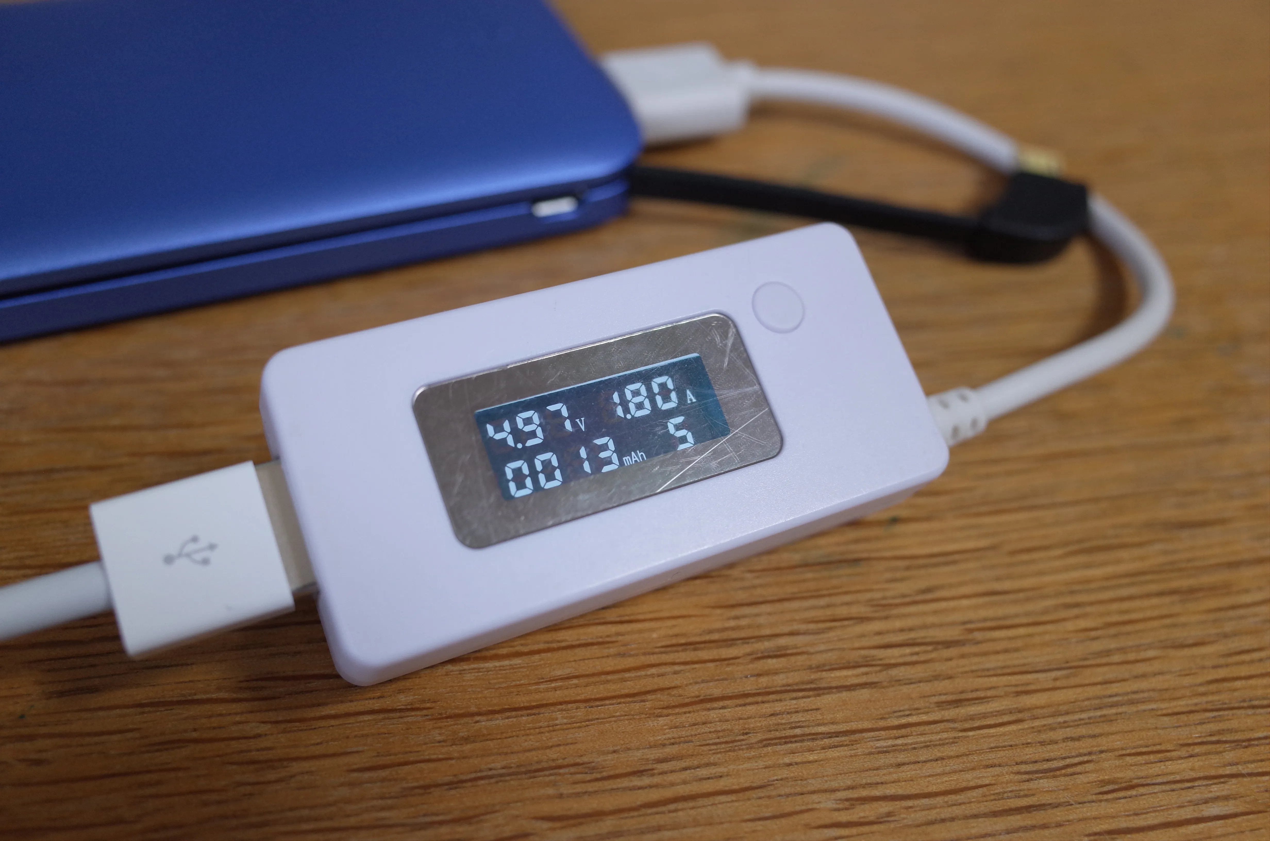 入出力電流を簡易的に計測してみました。こちらはモバイルバッテリー本体への充電。付属のmicroUSBケーブルを使用しましたが、しっかり2.0A近く出ています。本体への充電が遅いモバイルバッテリーは辛いので、これはGood。