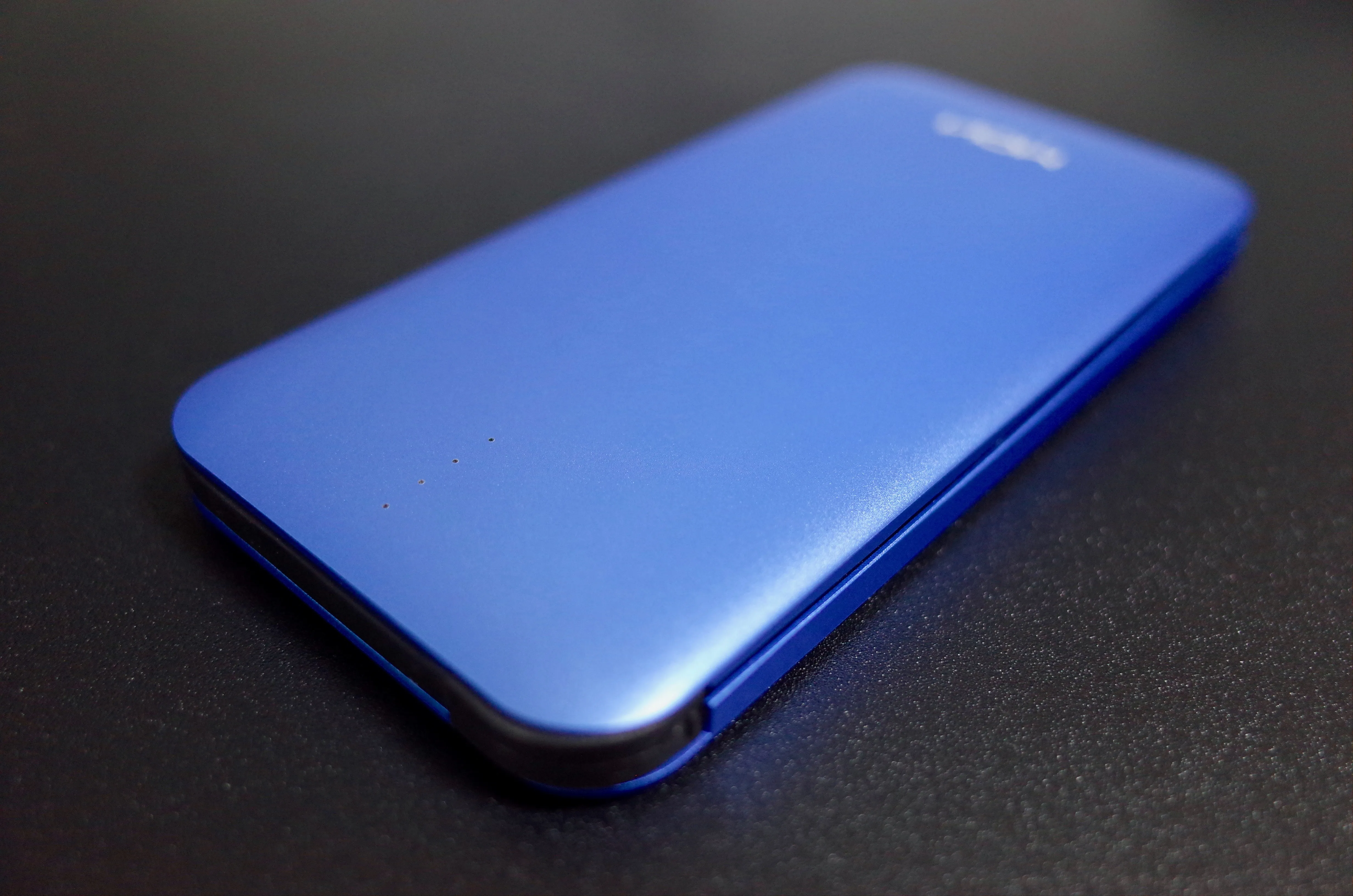 10000mAhと、比較的大容量なモバイルバッテリーではありますが、軽量かつ小型にまとまっています。丸みを帯びたアルミ製なので手触りも良いです。MacBookの表面みたい。