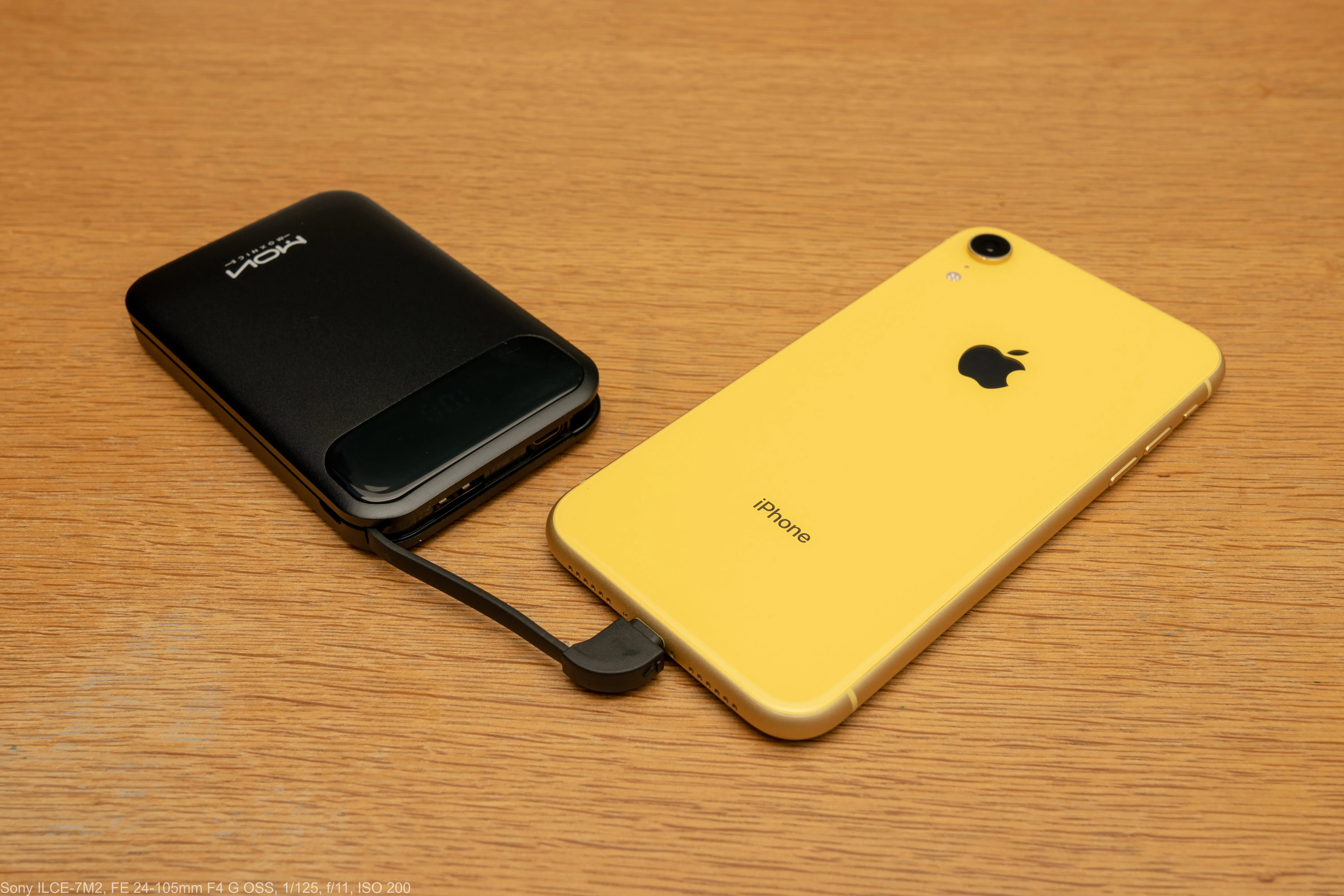 iPhone XRと接続したところ。本体のコンパクトさが伝わると思います。