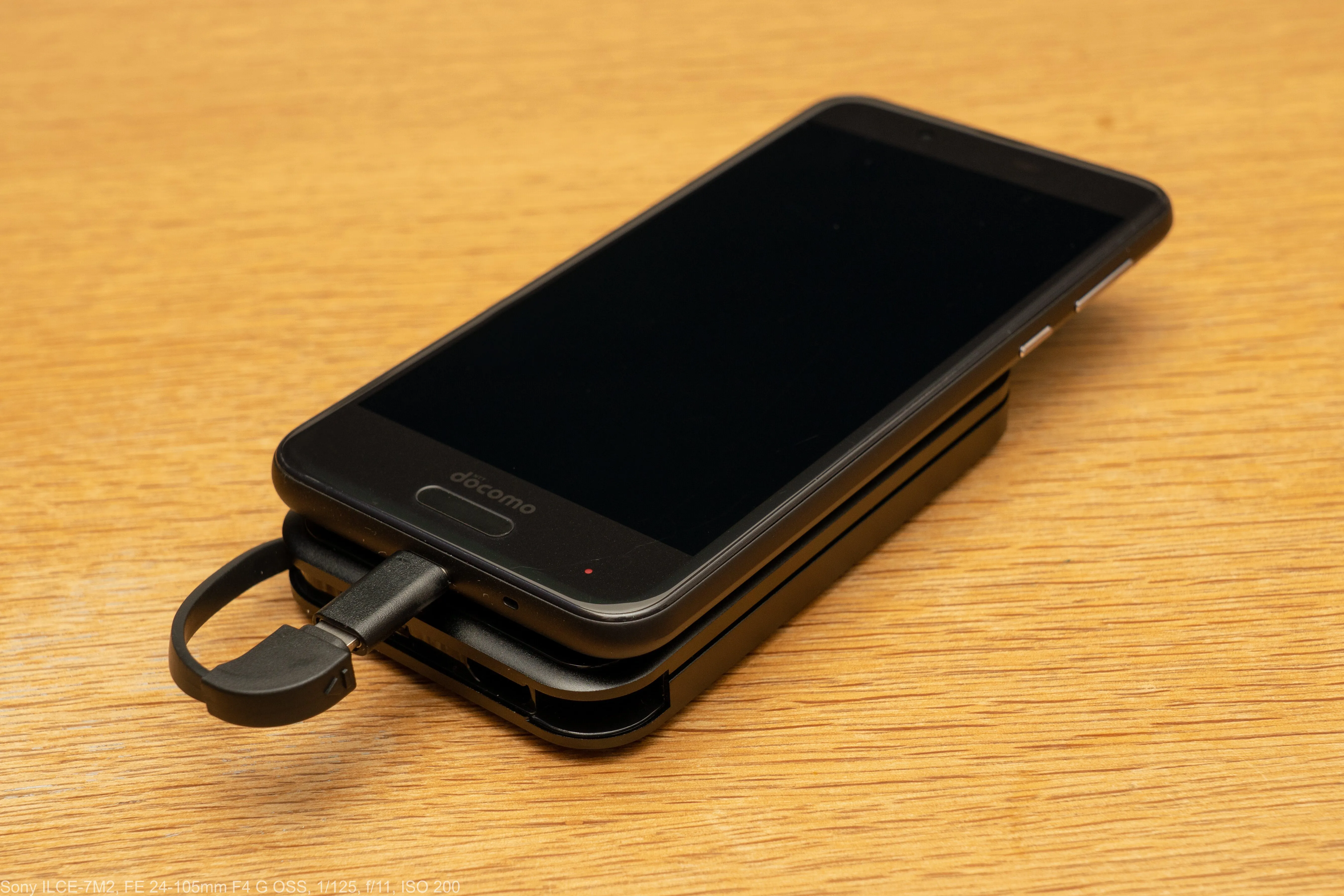 AQOUS senseと接続。内蔵ケーブルは短いですが、このようにスマートフォンと重ねて使うのにちょうど良い長さです。本体に収納されているType-C変換コネクタを使用しています。