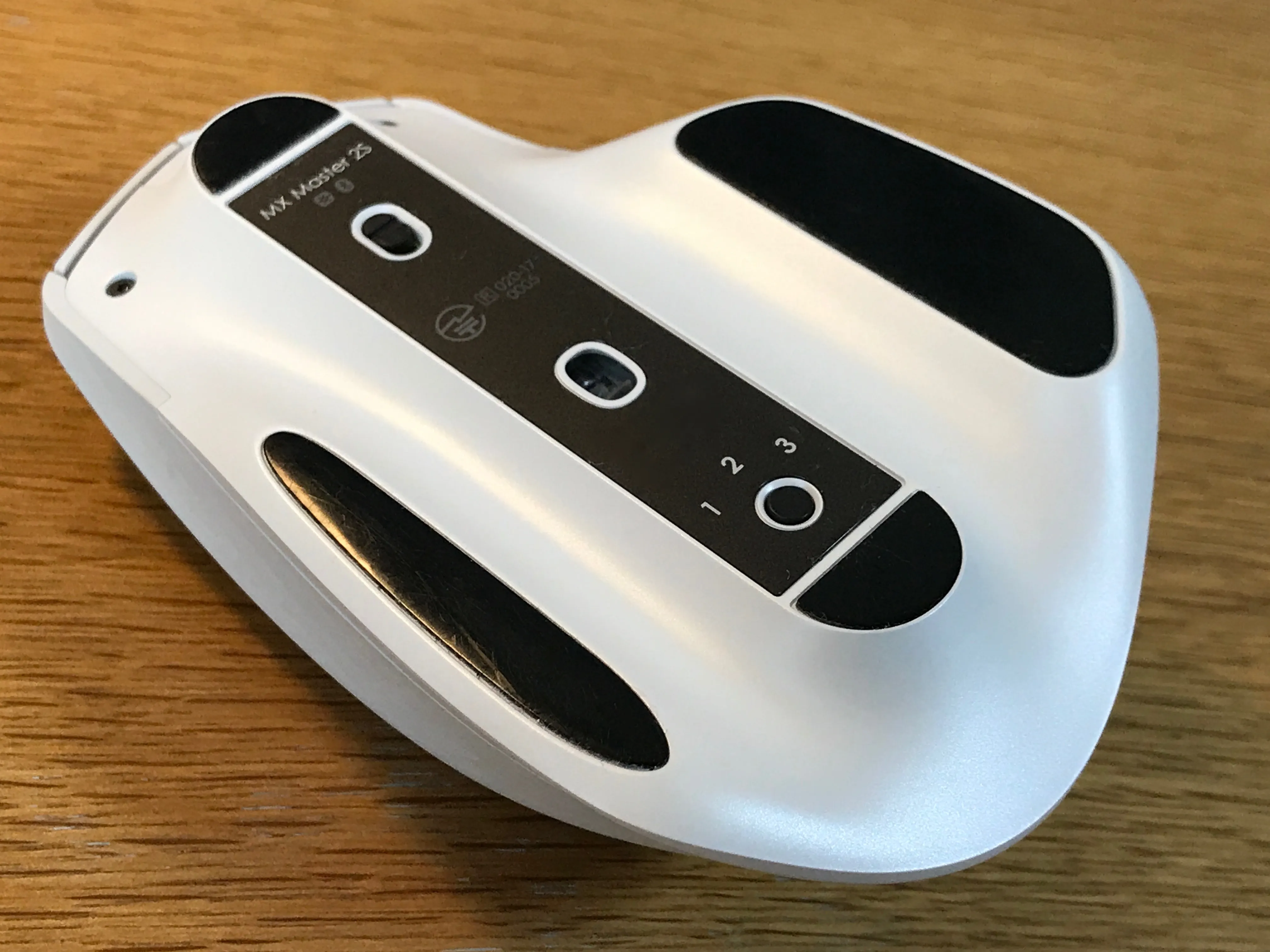 裏側。マウスをひっくり返すと、まるでカブトムシをひっくり返した時のような謎の征服感を感じるのは僕だけでしょうか。 それはともかく、裏面には電源スイッチ、センサ、ペアリング切り替えボタンがあります。MX Master 2Sは、BluetoothまたはUnifyingで合計3台のPCとのペアリングが可能。ボタンを押すだけで即座にペアリング先が切り替わります。
