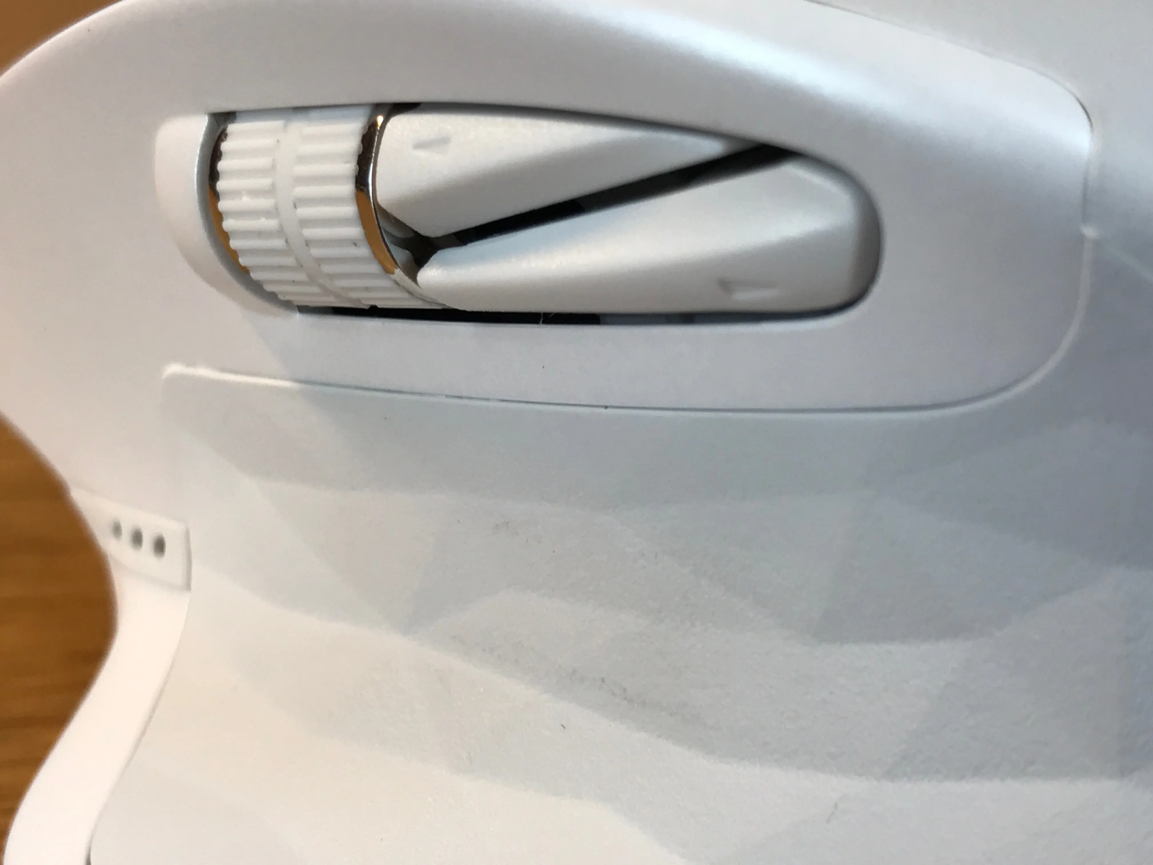 サイド部。非常に分かりにくいですが、親指の乗る部分も下方向に押し込めるボタンとなっています。(やや隙間が空いているのが分かるでしょうか)