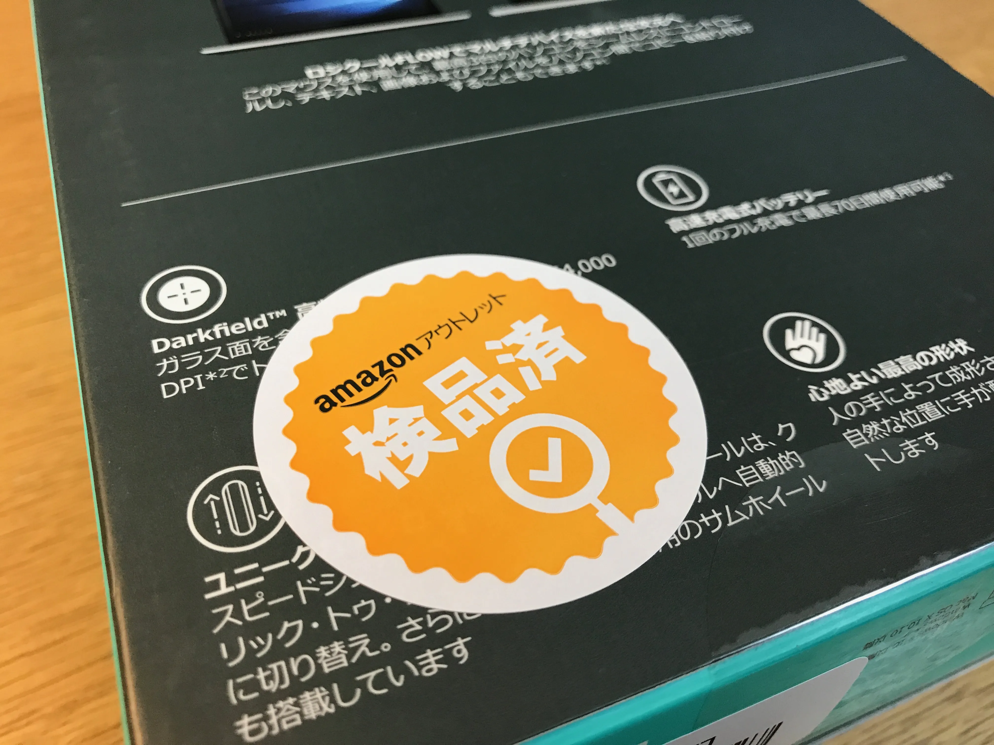 Amazonアウトレット検品済のステッカー。一度開封してしっかり検品しているらしく、箱上部はAmazonロゴ入りのテープで閉じ直されていました。amazonアウトレットは何度か利用していますが、値段が安い上に配送も当然速いのでとてもオススメ。