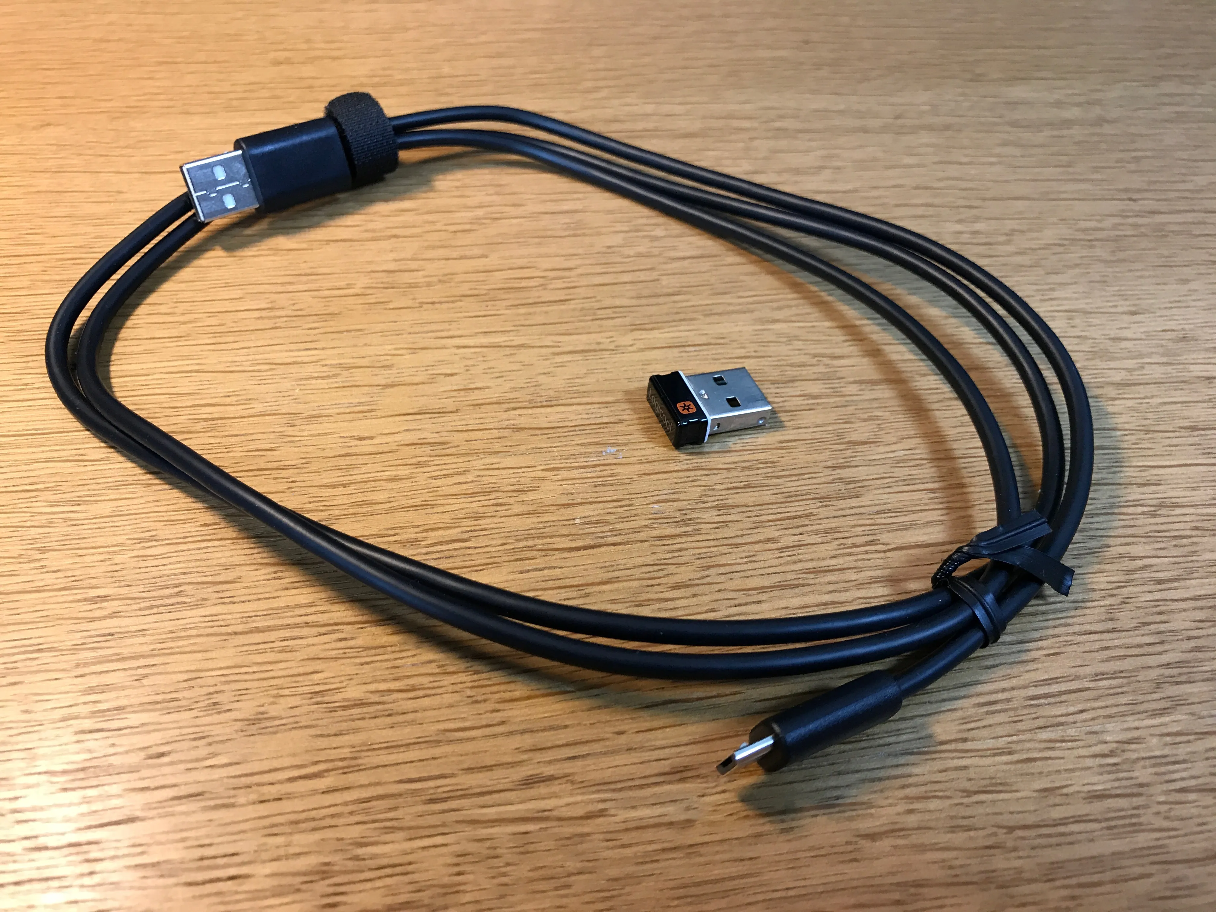 付属品はシンプルに充電用microUSBケーブルとUnifyingレシーバのみ。あと保証書。2年保証でした。
