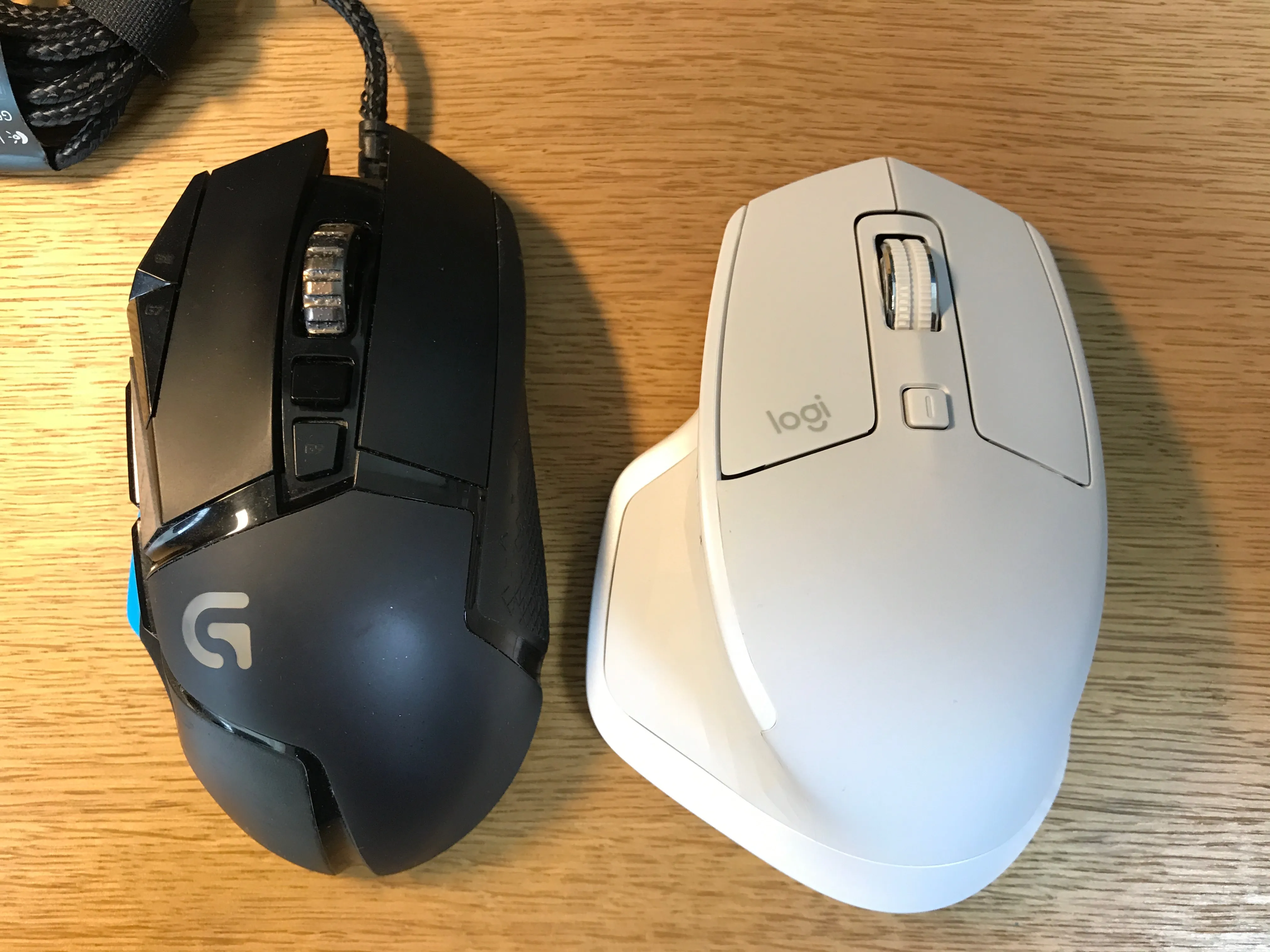 上から。MX Master 2Sが横に大きいのが伝わるでしょうか。G502もどちらかと言えば大柄なマウスですが、持った時の手への収まり感はG502の方が優れています。が、MX Master 2Sの方が自然に手に沿った形になっています。