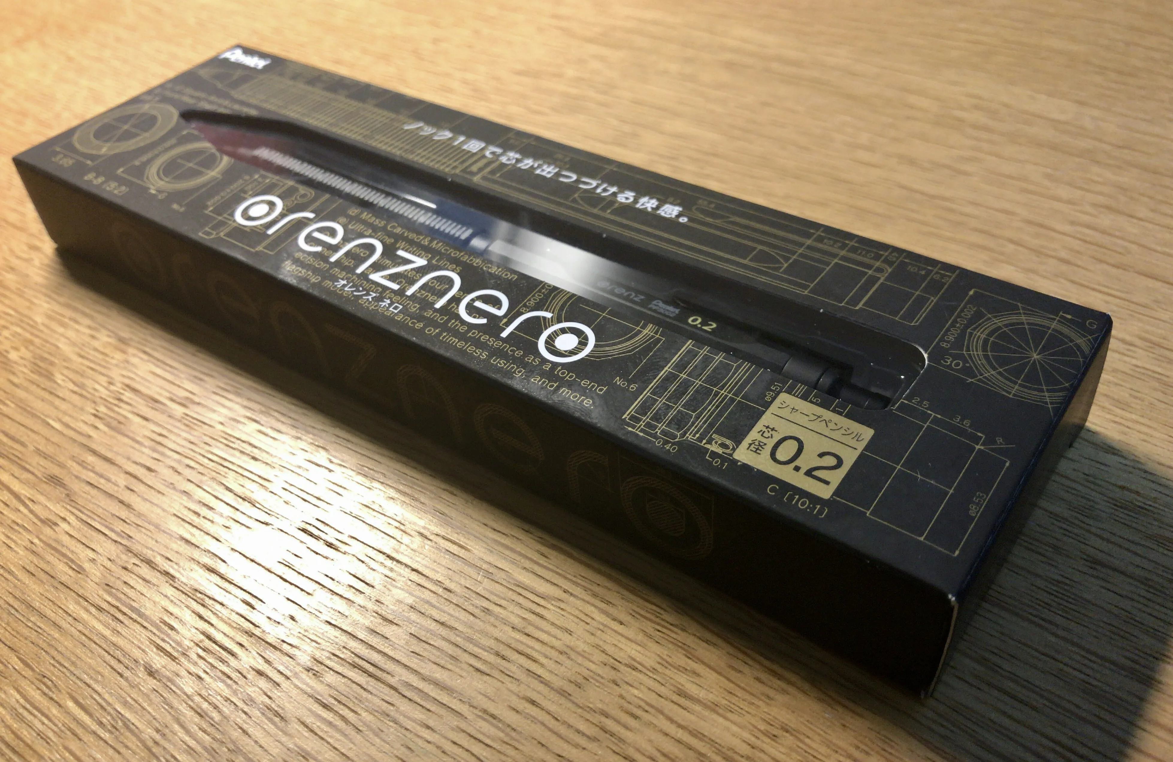 さほど高級感もない箱ですが、各部の寸法の書かれた設計図のようなデザインは素直に格好よく、高級感よりも実用性 の高級シャープペンシルであることが伝わってきます。