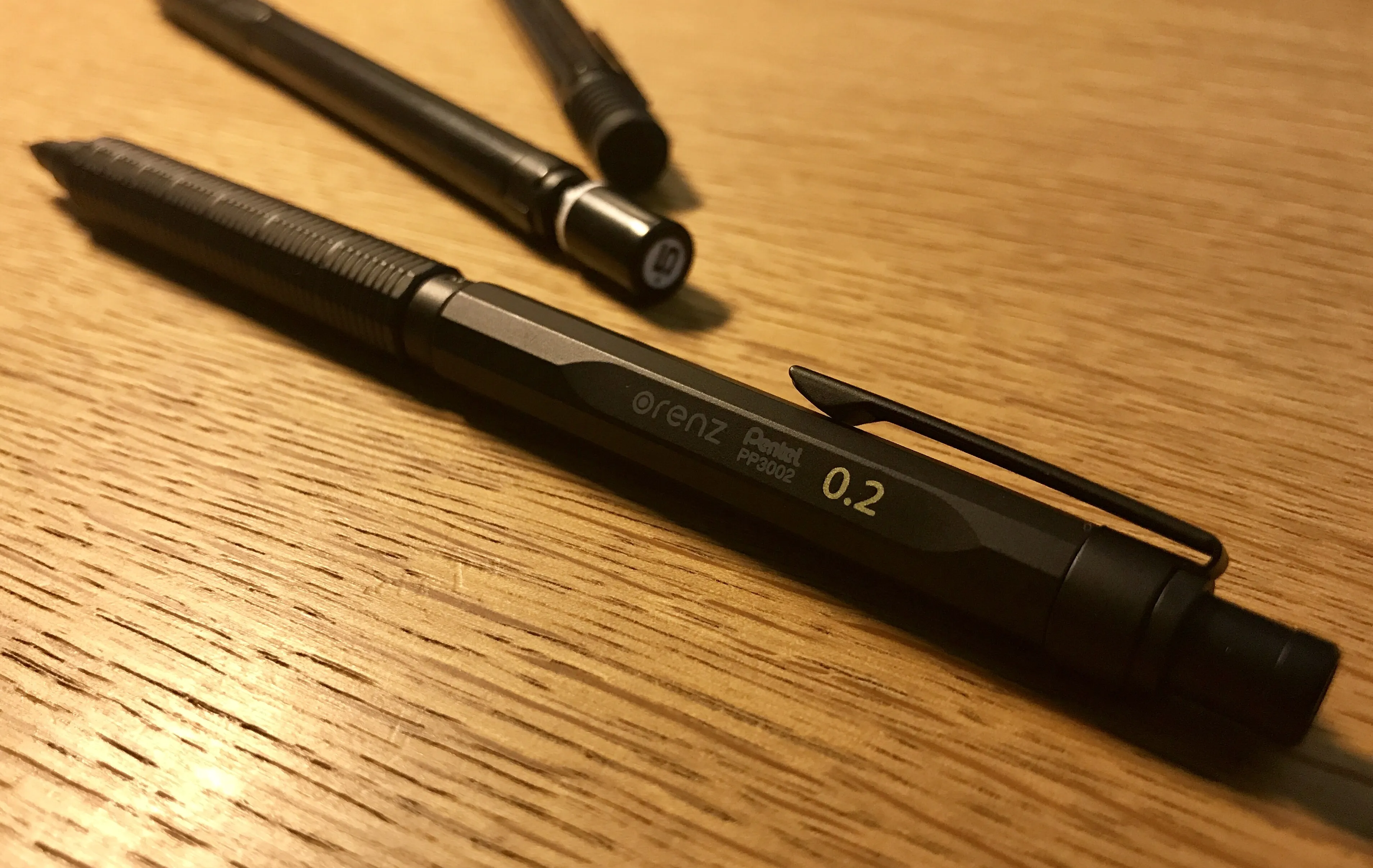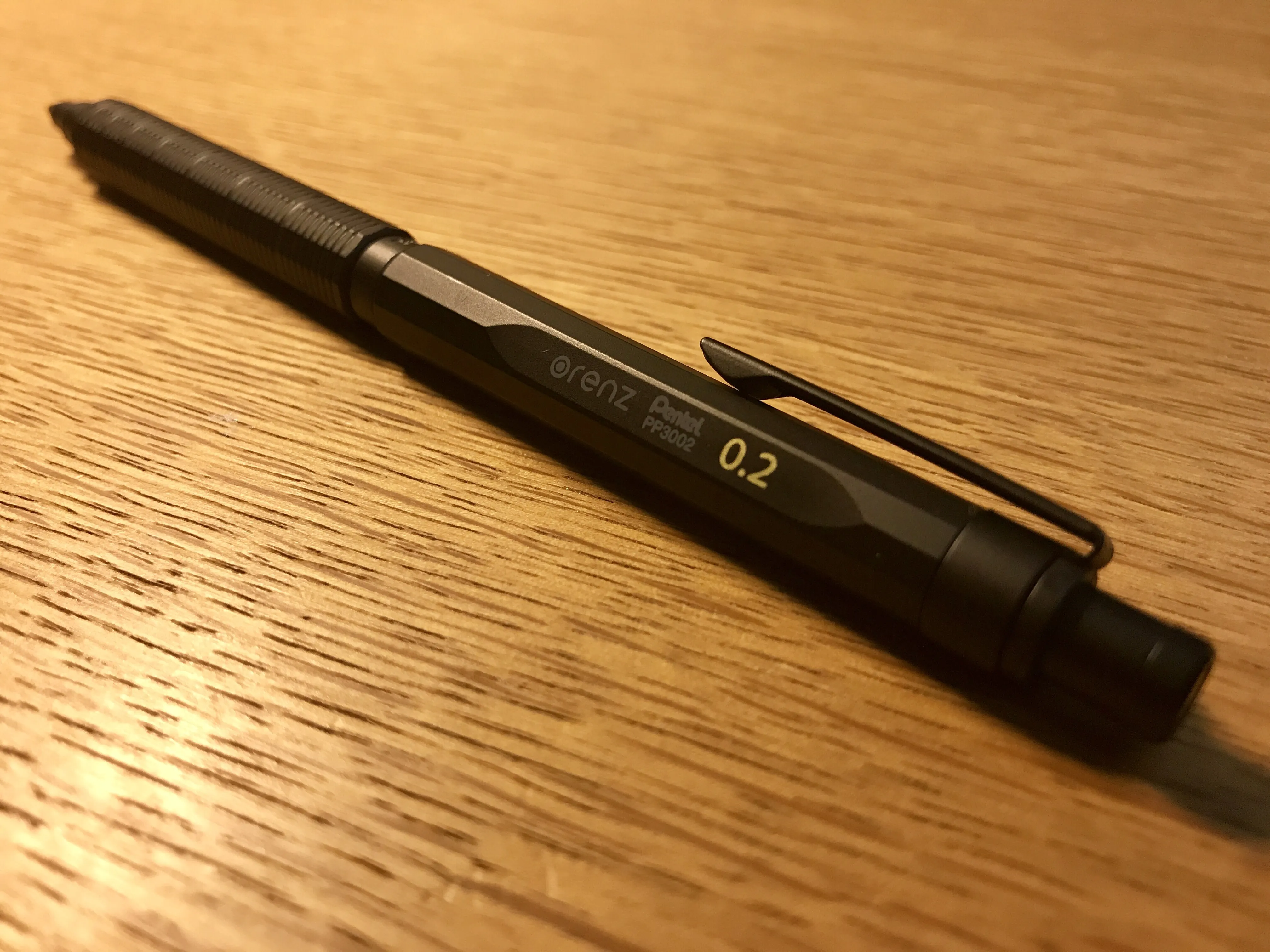 さすがオレンズシリーズ。ペン先からはほんの僅かしか芯が出ていません。折るのはほぼムリですね。普段0.5でHBでも濃く感じることもある僕ですが、それでも0.2ではBでちょうど良いくらいなので、人によっては2B芯の購入を考えた方がいいかも 。20本で216円なので、0.2芯も案外安い。 Twitter等で入手した人の感想を見ていると、パイプが紙に当たって書きにくいという意見も散見されますが、僕は大丈夫でした。ペンを寝かせて書く人は0.3の方がいいかもしれませんね。 自動芯繰り出し機構、最高~~~~~!!!!! 実物を触るまでちょっと疑ってたんですが、ホントにノック要らないです。