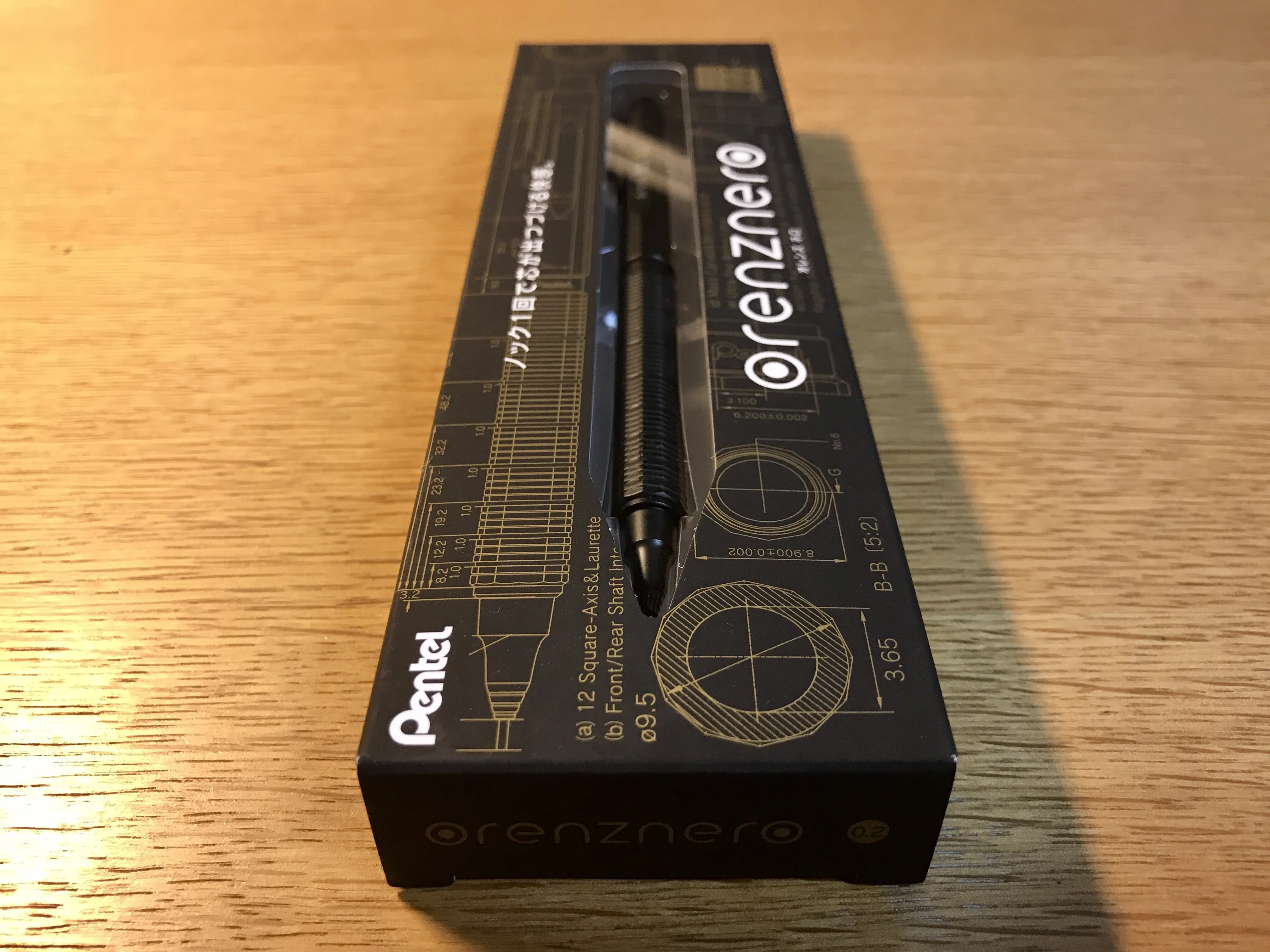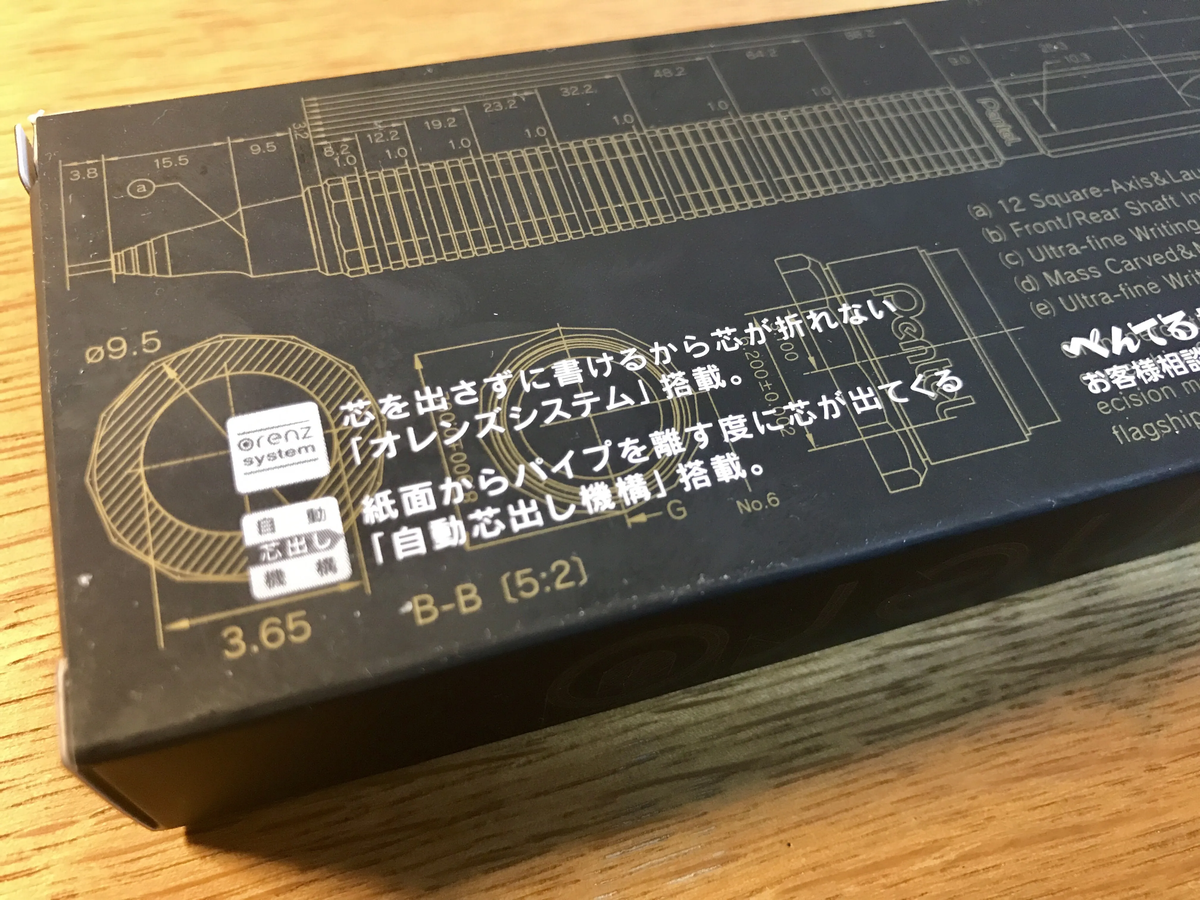 さほど高級感もない箱ですが、各部の寸法の書かれた設計図のようなデザインは素直に格好よく、高級感よりも実用性 の高級シャープペンシルであることが伝わってきます。