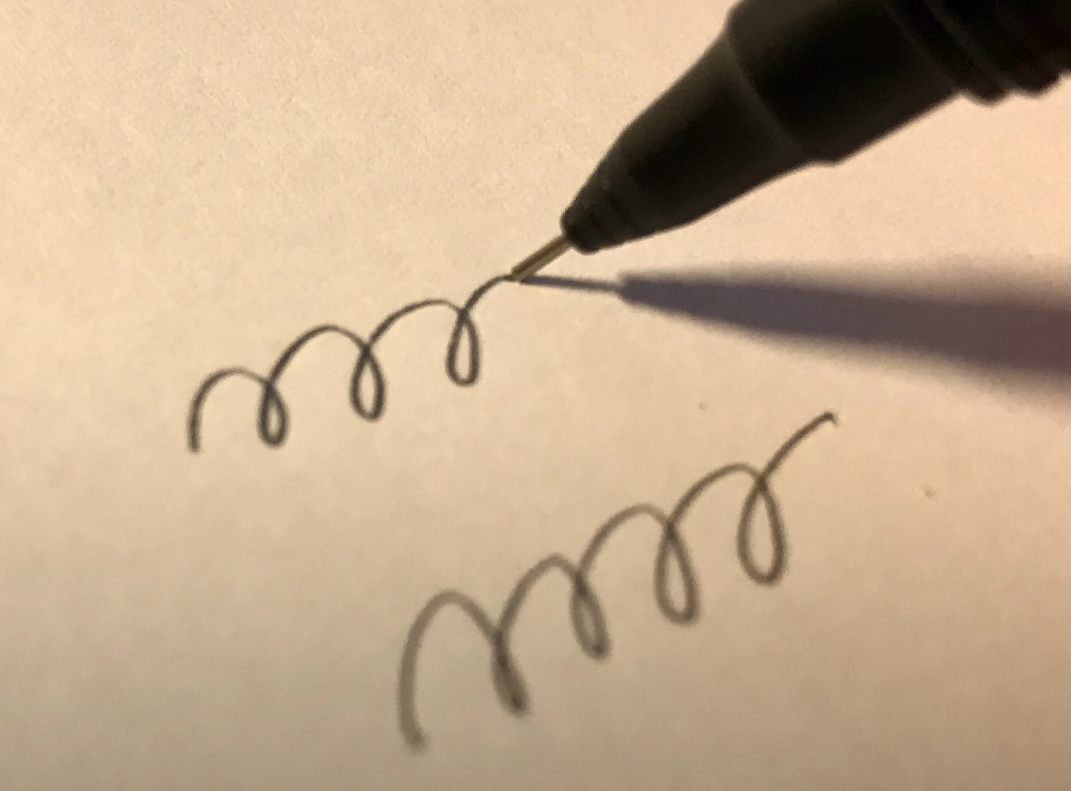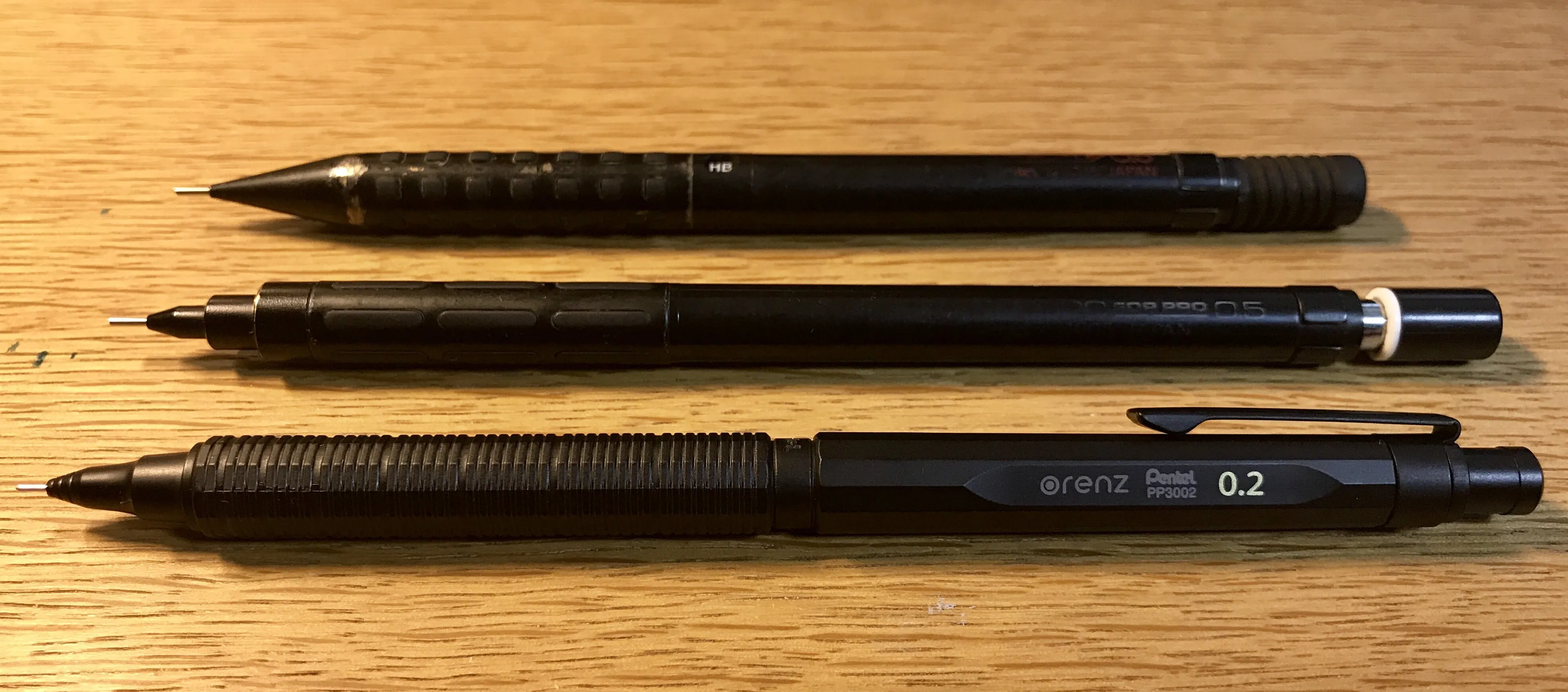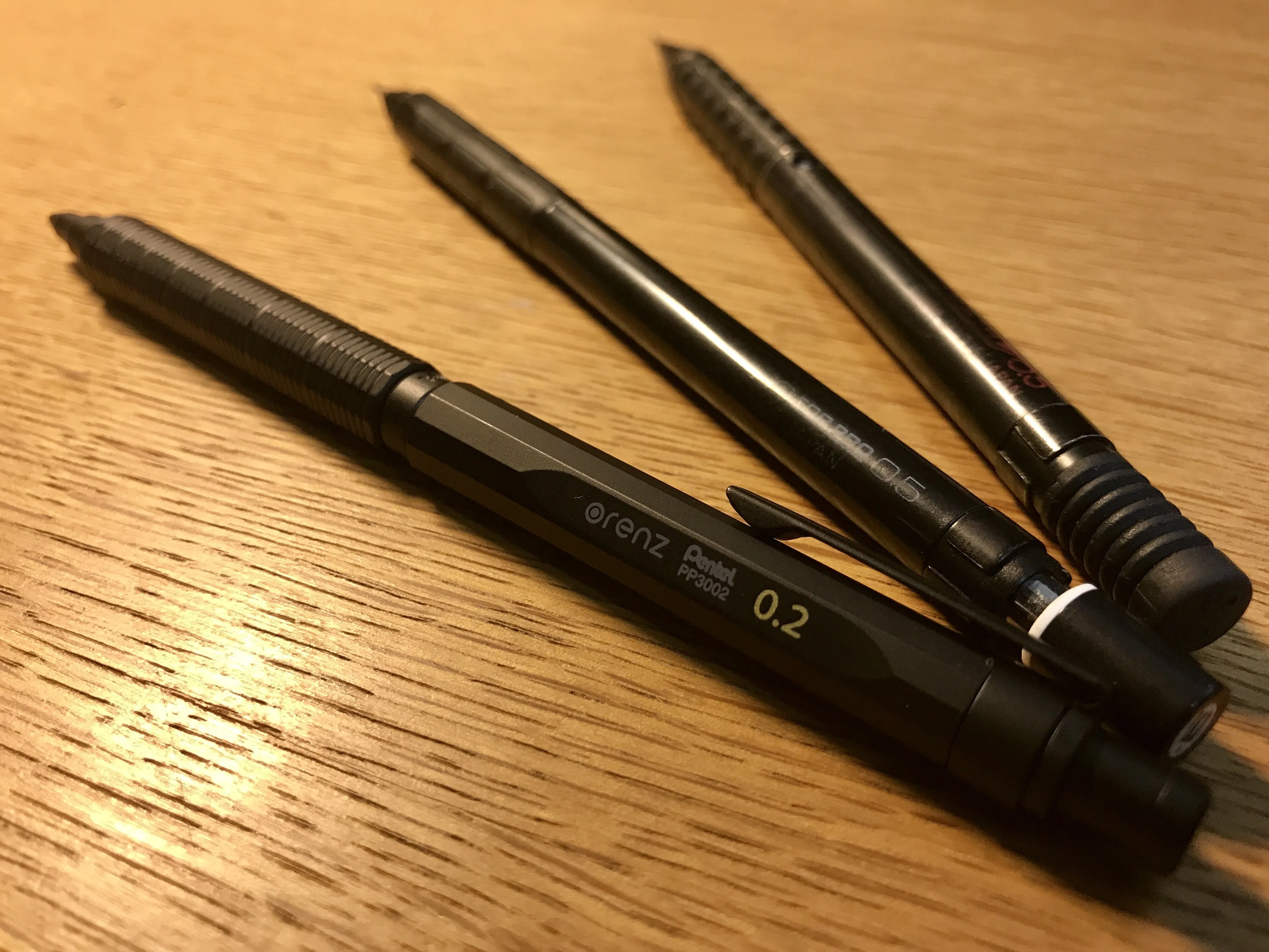 さすがオレンズシリーズ。ペン先からはほんの僅かしか芯が出ていません。折るのはほぼムリですね。普段0.5でHBでも濃く感じることもある僕ですが、それでも0.2ではBでちょうど良いくらいなので、人によっては2B芯の購入を考えた方がいいかも 。20本で216円なので、0.2芯も案外安い。 Twitter等で入手した人の感想を見ていると、パイプが紙に当たって書きにくいという意見も散見されますが、僕は大丈夫でした。ペンを寝かせて書く人は0.3の方がいいかもしれませんね。 自動芯繰り出し機構、最高~~~~~!!!!! 実物を触るまでちょっと疑ってたんですが、ホントにノック要らないです。