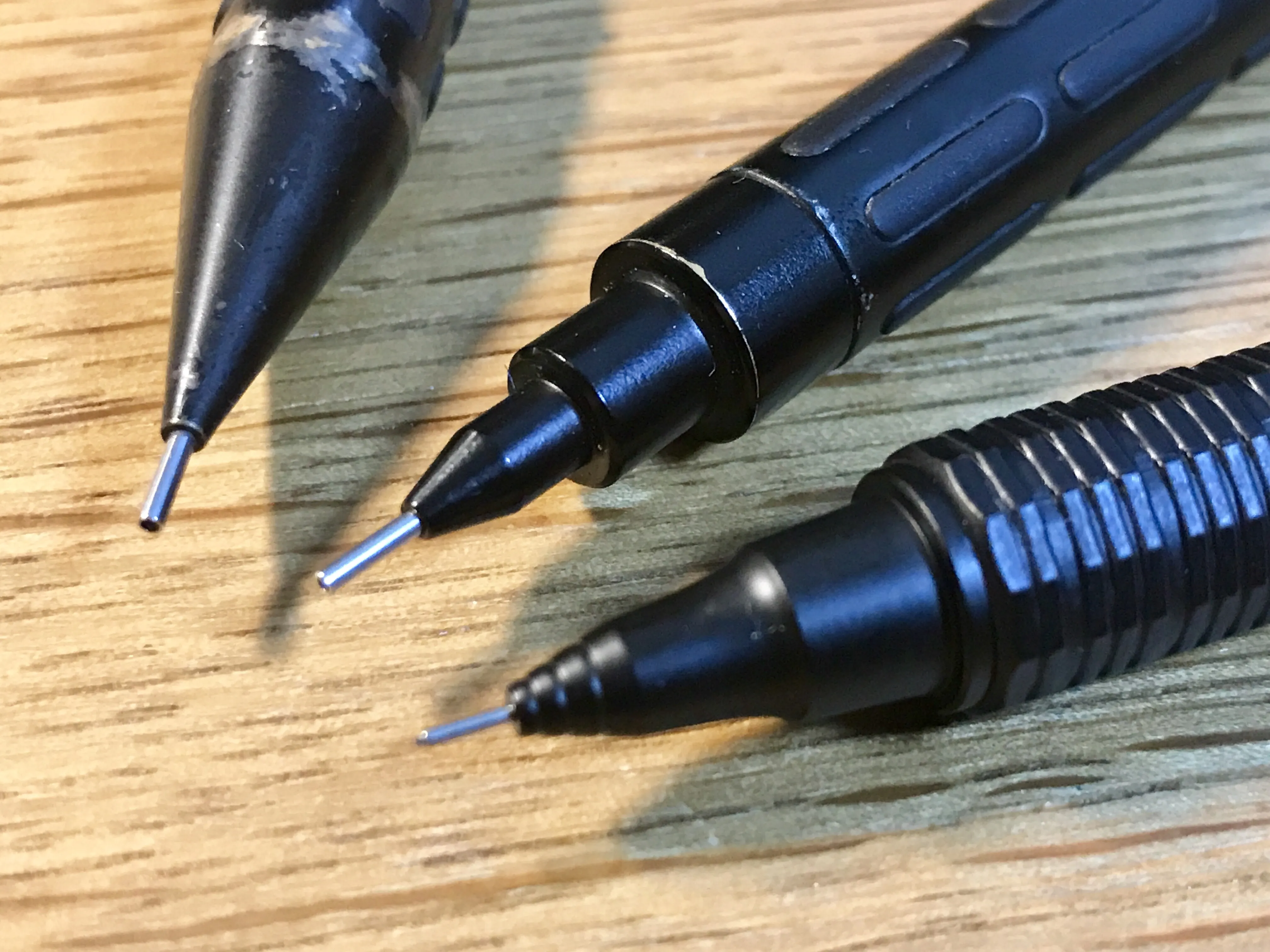 0.2なだけあり、0.5のものと比べてもペン先のパイプはかなり細くなっています。ペンケースのなかで破損してしまわないか不安になりますが…