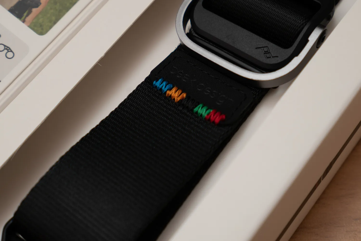 正式なデザイン名は聞きそびれてしまったのですが、「オリンピックデザイン」のようです。ステッチがオリンピックロゴの5色になっています。いいアクセントですね。基本的なカラーはスライドライトの「ブラック」モデルと同じようです。