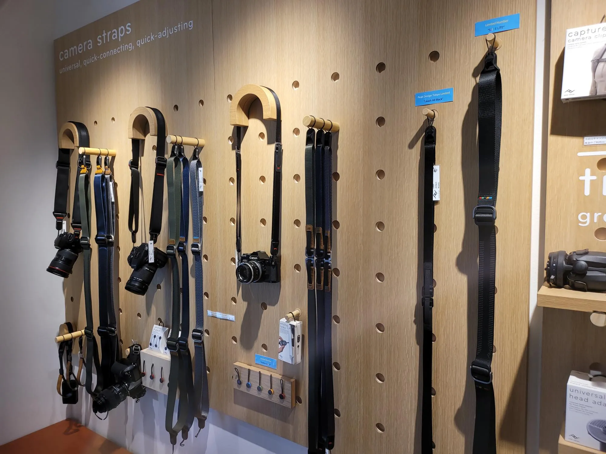 店内にはPeak Designのプロダクトが壁一面に並んでいます。カメラ用品では定番のPeak Design製品ですが、カメラバッグなどを気兼ねなく自由に触って試せる店は貴重。家電量販店でいちいち店員さんに声かけてショーケースから出してもらうのは手間。