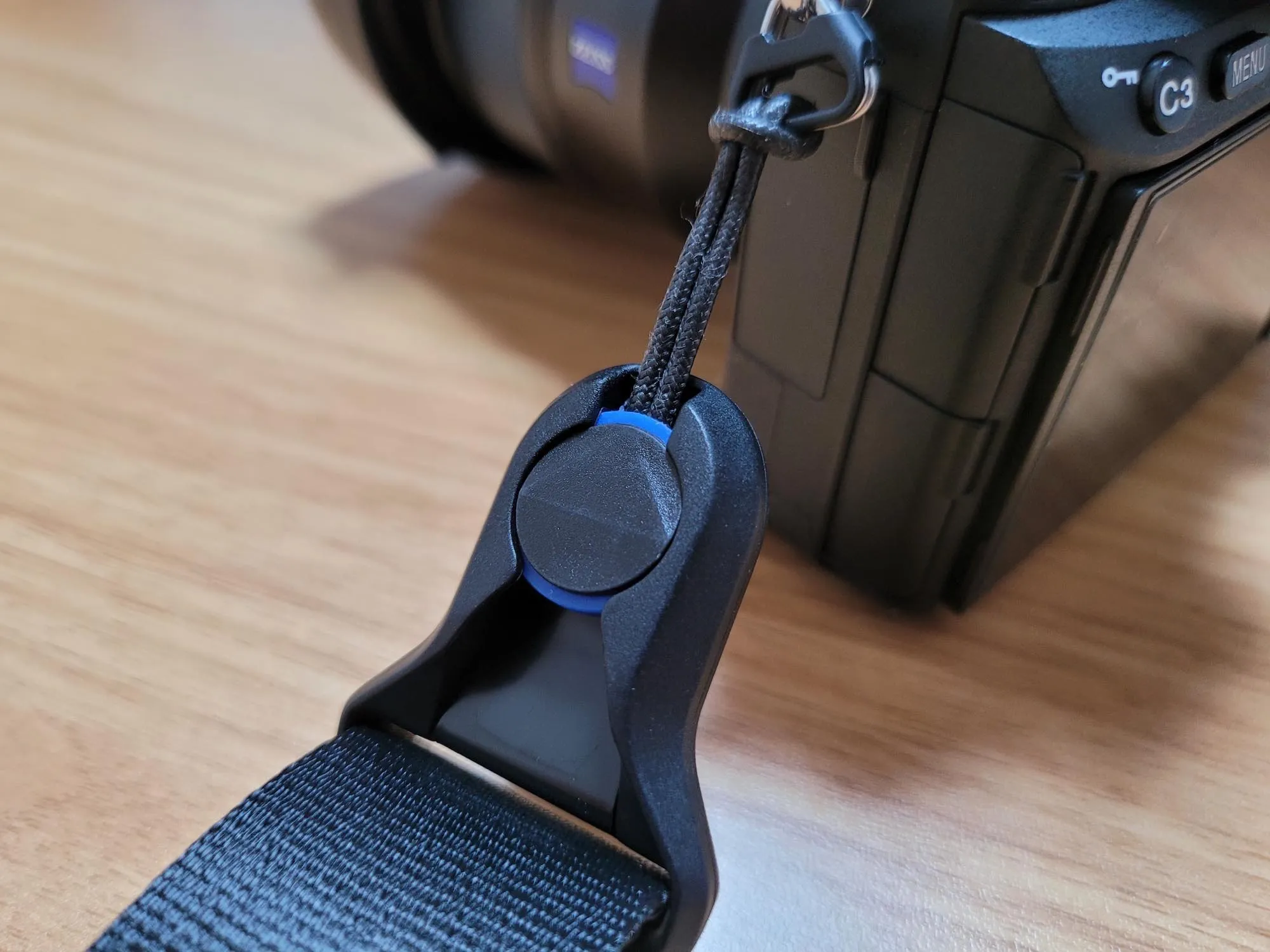 通常モデルのアンカーリンクスは赤ですが、付属品はブラックモデル。以前購入した銀一コラボモデルの青と並べてみました。ブラックはどんなカメラにも合いそうですね。